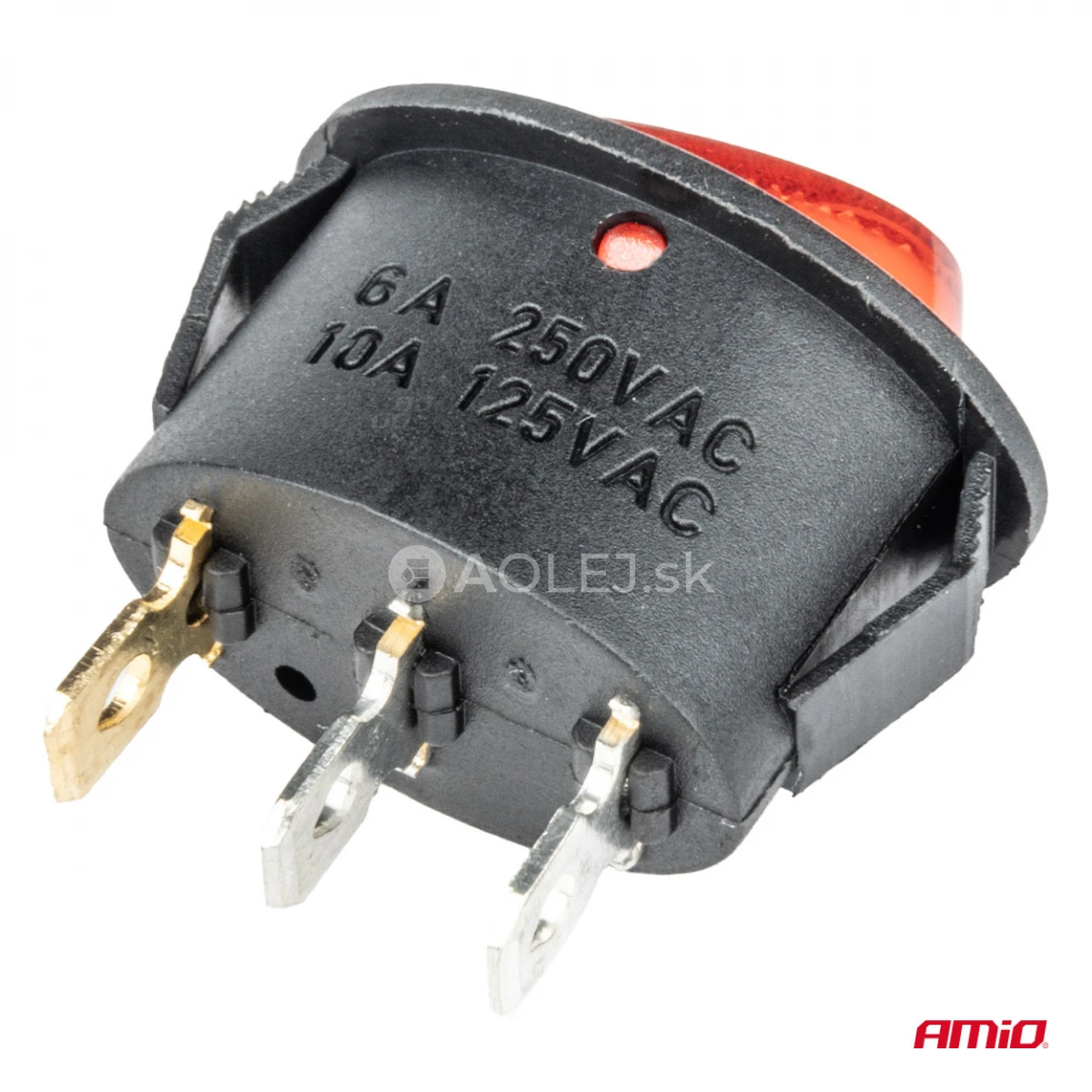 Prepínač kolískový okrúhly s červeným podsvietením 12/230V čierny, 2 polohy (zapnutý/vypnutý) .Pri zapnutí sa rozsvieti ČERVENÁ žiarovka.