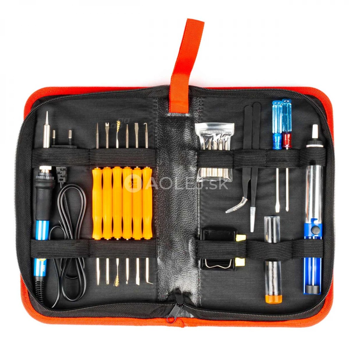 V súprave nájdete mnoho užitočných dielov, ako je stojan na spájkovačku, náhradné spájkovacie hroty, spájkovací drôt, skrutkovač a zváracie nástroje. Spájkovacie odsávanie s nerezovou tyčou a protišmykovou textúrou umožňuje prácu so spájaním malých kovových prvkov a pinzeta uľahčuje prácu na ťažko dostupných miestach.
