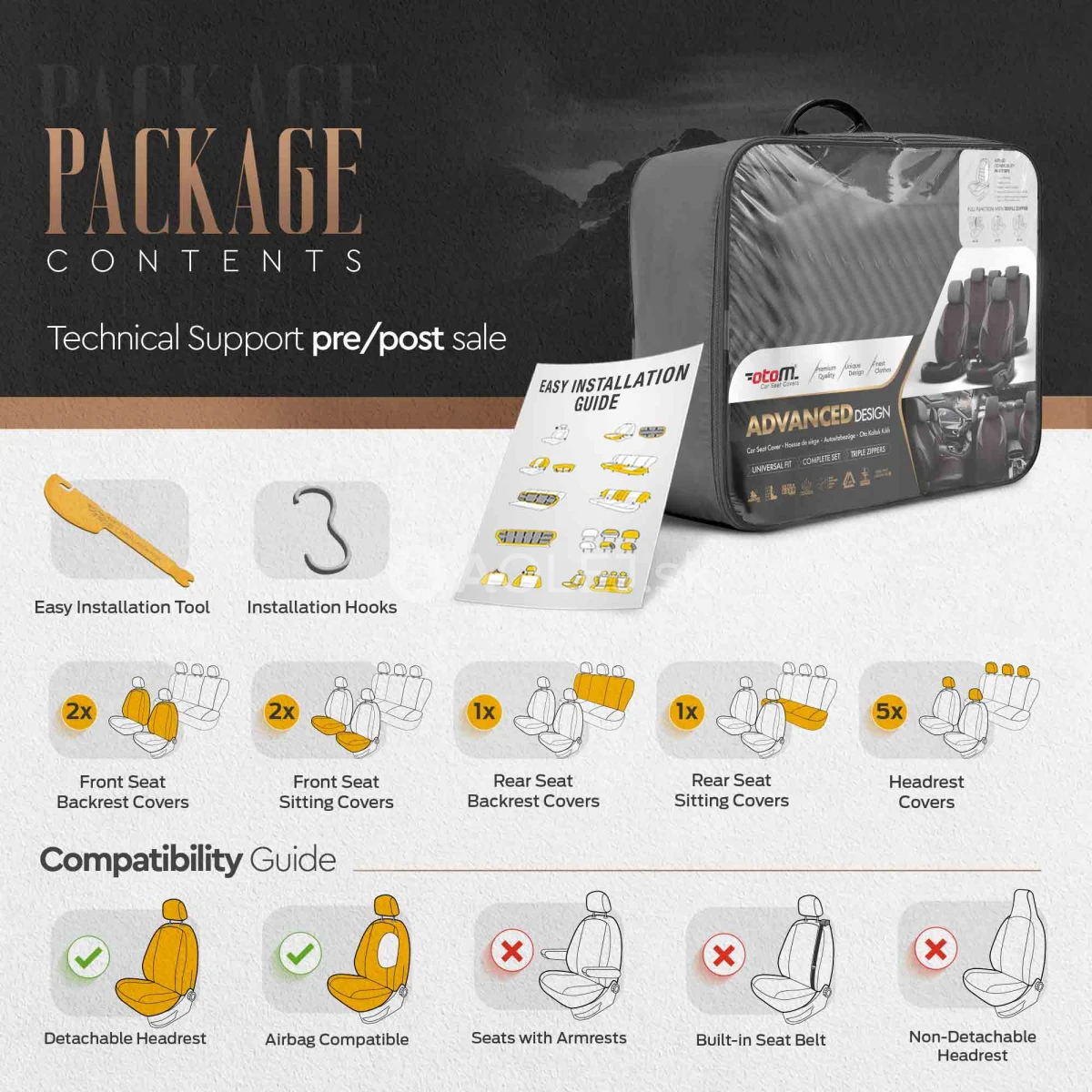Poťahy majú zapínanie na zadnom sedadle, vďaka čomu pasujú na väčšinu sedadiel dostupných na trhu (nedelené pohovky).