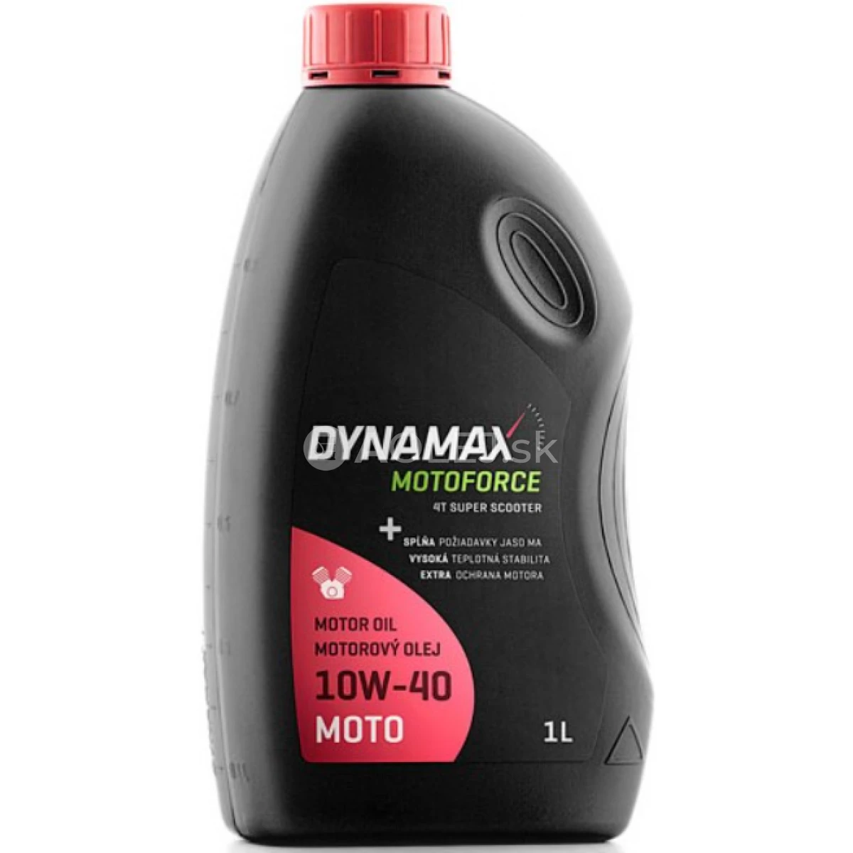 Dynamax Motoforce 4T Super Scooter 10W-40 je vysoko kvalitný polosyntetický olej odporúčaný pre vysoko výkonné štvortaktné vzduchom chladené benzínové motory motocyklov. Je založený na vysoko kvalitných minerálnych a syntetických základových olejoch v k ombinácii so špeciálnymiaditívami. Olej má vynikajúce protioderové a protikorózne vlastnosti. Poskytuje dokonalú ochranu motora, prevodovky a mokrej spojky a to aj pri ťažkých prevádzkových podmienkach. Eliminuje preklzovanie spojky a zlepšuje jazdné vlastnosti. Obsahuje benzensulfónovú kyselinu, propénovanú, vápenatú soľ, prealkalizovanú. Môže spôsobiť alergickú reakciu.