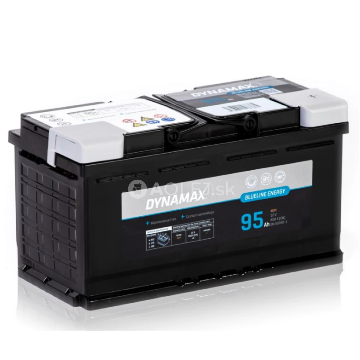 Dynamax Energy Blueline AGM 12V 95Ah 850A sú špeciálne vyvinuté autobatérie pre autá s funkciou štart-stop, funkciou rekuperácie brzdnej energie a iným technológiám napomáhajúcim šetreniu paliva. Primárne sú určené pre mikro-hybridné, vysoko výkonné moderné autá ktoré vyžadujú vyššie prevádzkové parametre aké poskytujú klasické konvenčné batérie. Batéria napomáha opätovnému naštartovaniu pri častom vypínaní a zapínaní motora, a to vďaka odolnosti voči trojnásobne vyšším cyklom nabíjania a vybíjania. Batérie sú bez-údržbové. Vďaka Polypropylénovému obalu sú vysoko odolné a odolávajúce otrasom. Pevné a odolné proti úniku elektrolytu, kvapaliny a plynov- pri prevrátení nevytečie elektrolyt. Elektrolyt je viazaný v absorbčnej sklenenej rohožy (AGM). Nízke riziko samo-vybíjania. Spoľahlivé s vynikajúcim výkonom. Šetrné k životnému prostrediu