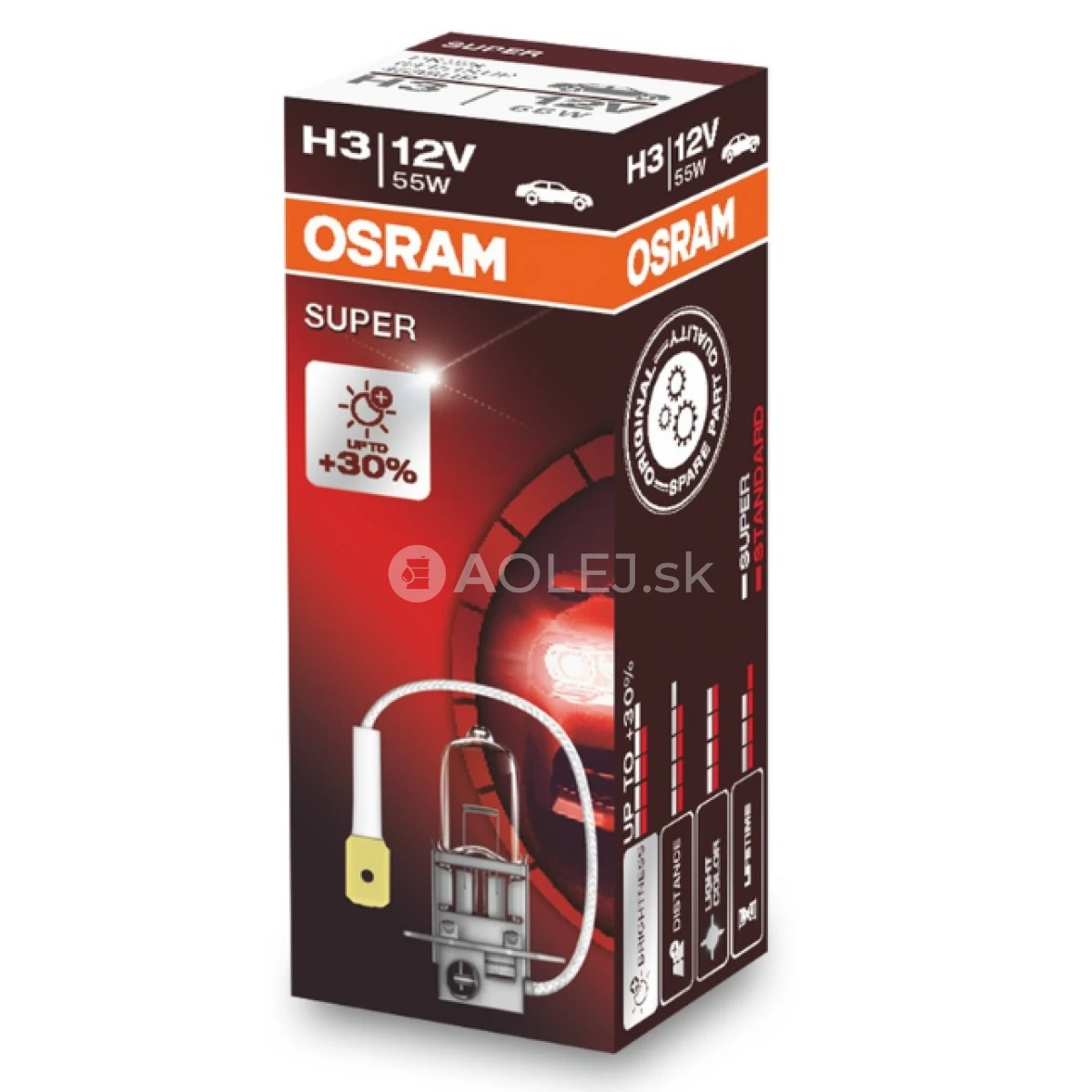 Osram H3 12V 5W PK22s Super sú autožiarovky, ktoré ponúkajú vyšší výkon a poskytujú o 30% viac svetla v porovnaní so štandardnými autožiarovkami. Vďaka tomu je možné rýchlejšie rozpoznať značky, prekážky a nebezpečenstvo. Veľmi dobrý jas. Žiarovka do halogenových svetlometov, hmloviek od kvalitného Nemeckého výrobcu OSRAM.