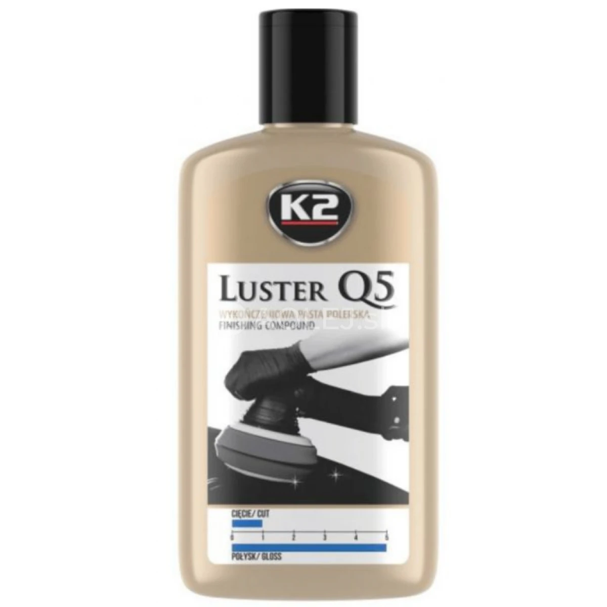 K2 Luster Q5 Blue je dokončovacia leštiaca pasta. Je to mlieko na použitie v poslednom kroku leštenia laku alebo iných povrchov. Eliminuje kruhové stopy po leštení (hologramy) a mikro-škrabance. Prinavracia veľmi vysoký zrkadlový lesk a obnovuje farby. Produkuje málo tepla pri prevádzke, takže neprichádza k prehriatiu povrchu. Doporučujeme ju hlavne na leštenie všetkých druhov autolakov, priemyselných náterov, reflektorov, celulóz, nábytku s umelým povrchom, akrylátov a mnoho ďalších.