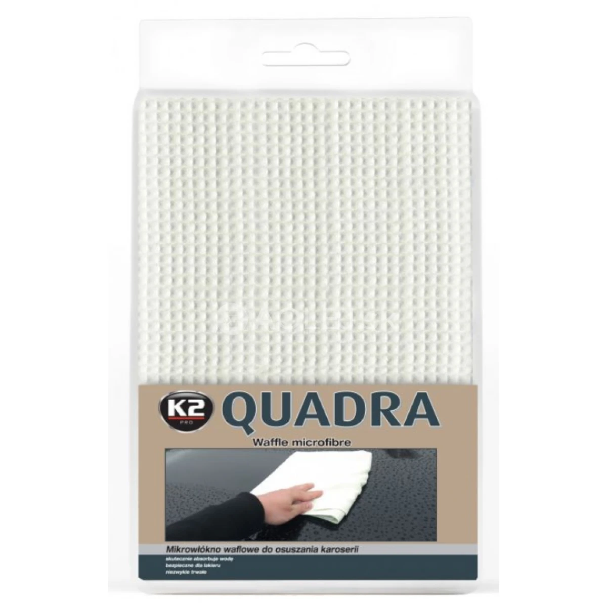 K2 Quadra Wafer Microfiber /utierka z mikrovlákna/ je mikrovlákno vytvorené so špeciálnou waffle štruktúrou, ktorá absorbuje vodu omnoho rýchlejšie a efektívnejšie ako bežné mikrovlákna. To znamená, že vaše auto je rýchlejšie a efektívnejšie bez vlhkosti, a to bez zbytočného úsilia. Bez ohľadu na to, aký je váš automobil citlivý na škrabance, K2 QUADRA / WAFFLE mikrovlákno je tu, aby zabezpečilo jeho bezpečnosť. Je navrhnuté tak, aby nespôsobovalo škrabance na laku, takže môžete byť pokojní, že váš automobil je v bezpečí. Toto mikrovlákno je tiež nesmierne trvanlivé. Môže byť mnohokrát prané a sušené bez straty svojich unikátnych vlastností. To znamená, že na jedno mikrovlákno môžete dlhodobo spoliehať.