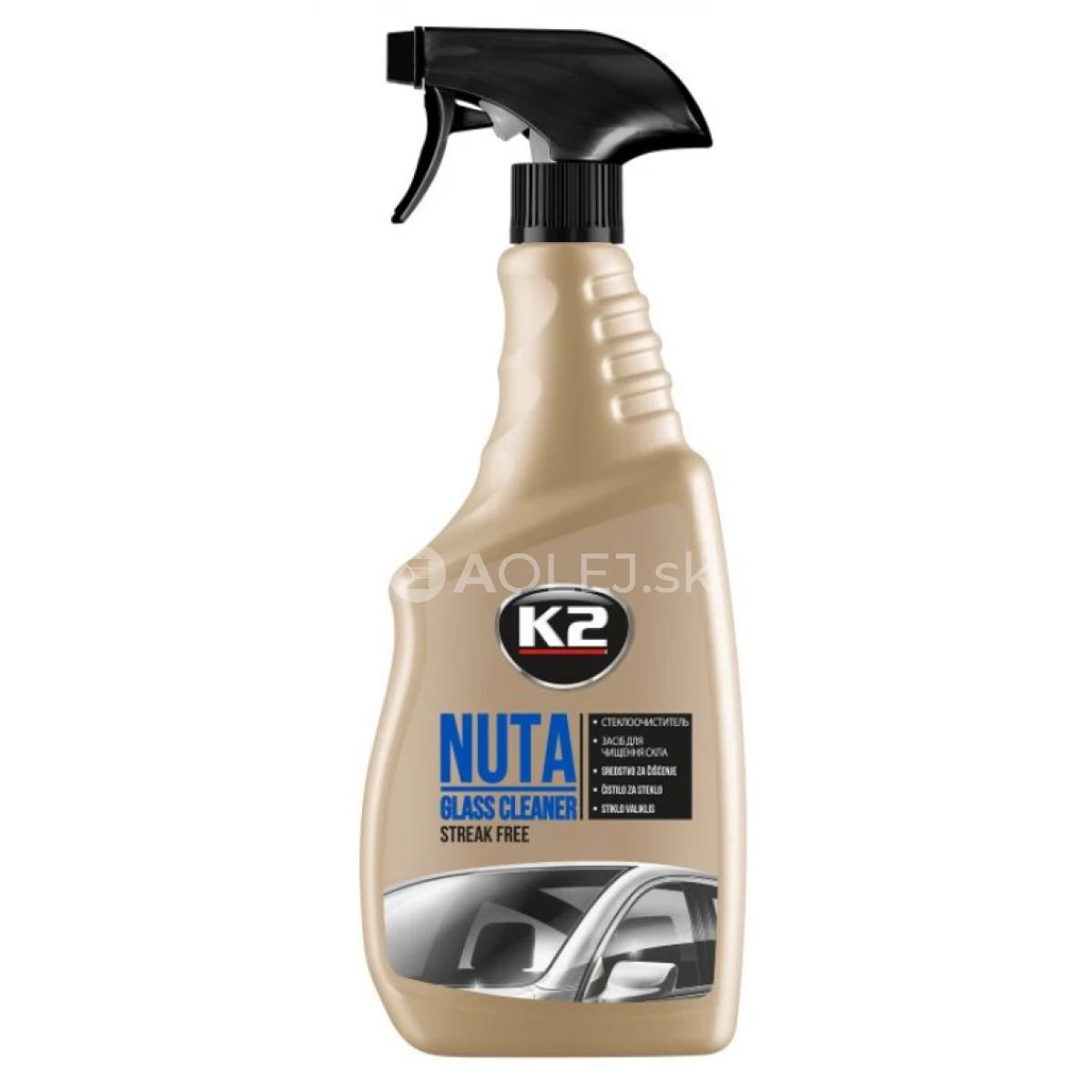 K2 Nuta je prípravok na čistenie skiel, svetlometov, plastov a laminátov. Ľahko odstraňuje prach a špinu. Vhodný pre použitie vo vnútri vozidla, odstraňuje nečistoty a mastný povlak cigaretového dymu. Dokonale umýva akýkoľvek prach a nikotínové usadeniny z hladkých povrchov (sklá, karoséria, plasty, chrómované povrchy, nehrdzavejúca oceľ, vinyl a iné); nezanecháva šmuhy.