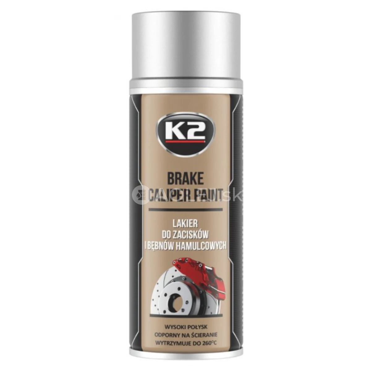 K2 Brake Caliper Paint Silver je profesionálny lak na lakovanie brzdových strmeňov a bubnov. Špeciálna receptúra terminálovej farby bola vyvinutá na báze živíc najvyššej kvality. Vďaka tomu vytvára K2 Brake Caliper Paint odolný náter s vysokou teplotnou odolnosťou až do +260 stupňov Celzia. Farba brzdových strmeňov v plechovke K2 dodáva strmeňom módny a štýlový povrch s vysokým leskom. Lak vytvorený na povrchu strmeňa po lakovaní je vysoko odolný voči oderu, mechanickému poškodeniu, brzdovému prachu, chemikáliám (vrátane kvapalín na čistenie ráfikov), soli, benzínu, kyslým dažďom a nepriaznivým poveternostným podmienkam. Pôsobí aj proti korózii.