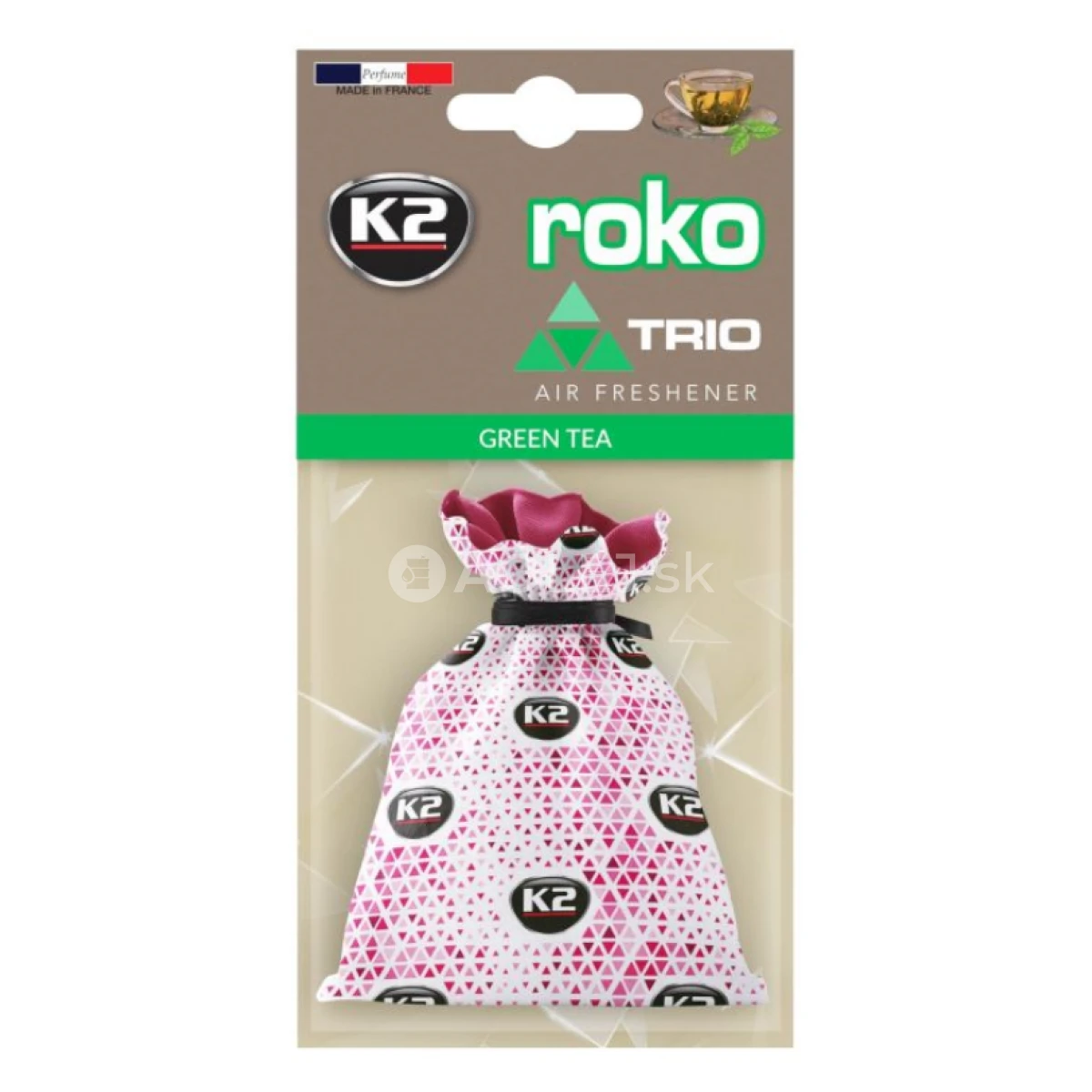 K2 Roko Trio Green Tea je osviežovač vzduchu v bavlnenej taške s fantastickou grafikou, ktorá očarí vás aj vašich pasažierov. Každá zo 6 nádherných vôní vám pomôže relaxovať a jedinečný grafický vzor rozžiari interiér vášho auta. Vďaka použitiu francúzskych vonných kompozícií uvoľňujú arómu až niekoľko týždňov. Ak hľadáte pekný osviežovač vzduchu s módnym vzhľadom, K2 Roko Trio bude tou správnou voľbou. Vôňa do auta K2 Roko Trio vďaka svojej forme nájde uplatnenie vo všetkých typoch miestností, ako aj v šatníkoch a skriniach.