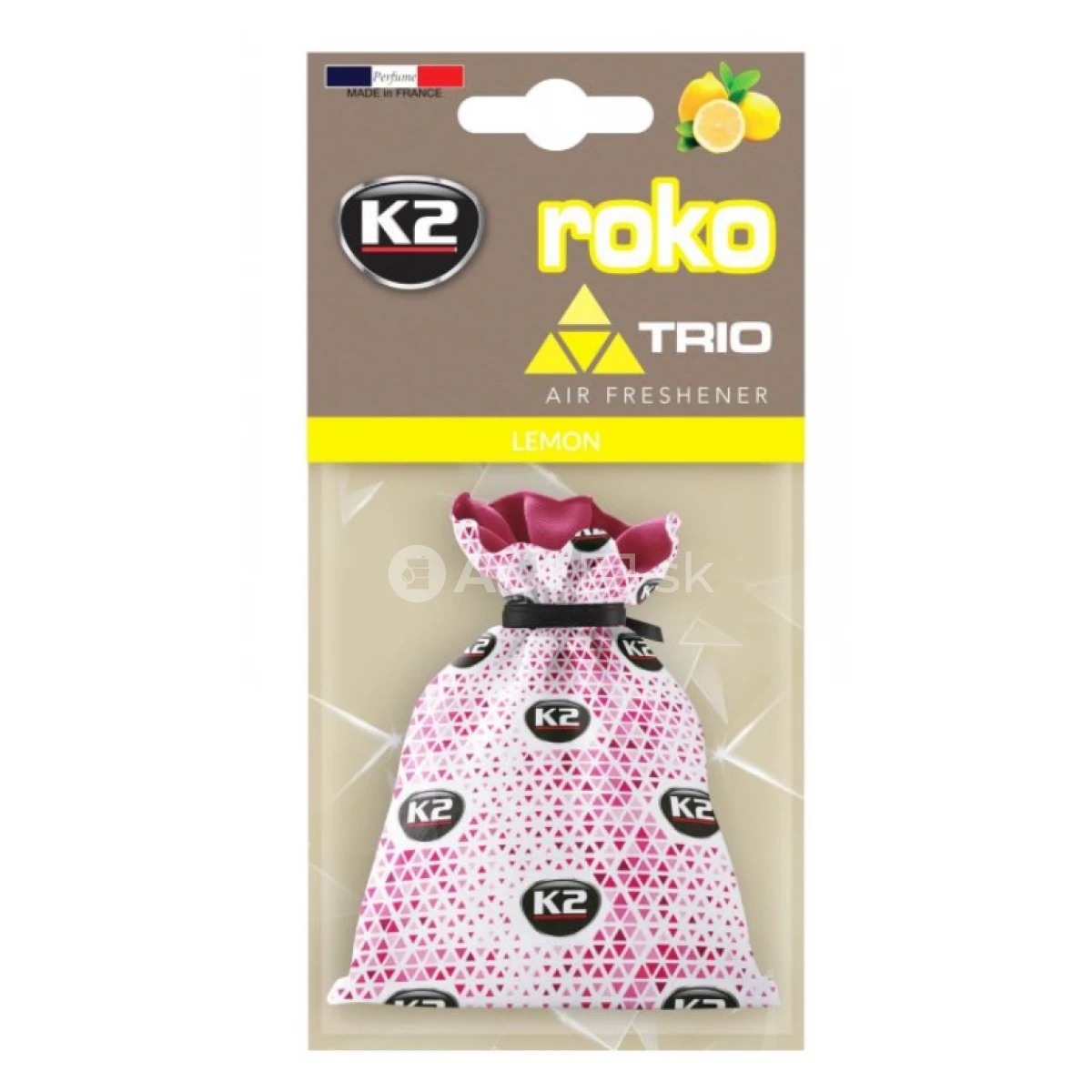 K2 Roko Trio Lemon je osviežovač vzduchu v bavlnenej taške s fantastickou grafikou, ktorá očarí vás aj vašich pasažierov. Každá zo 6 nádherných vôní vám pomôže relaxovať a jedinečný grafický vzor rozžiari interiér vášho auta. Vďaka použitiu francúzskych vonných kompozícií uvoľňujú arómu až niekoľko týždňov. Ak hľadáte pekný osviežovač vzduchu s módnym vzhľadom, K2 Roko Trio bude tou správnou voľbou. Vôňa do auta K2 Roko Trio vďaka svojej forme nájde uplatnenie vo všetkých typoch miestností, ako aj v šatníkoch a skriniach.