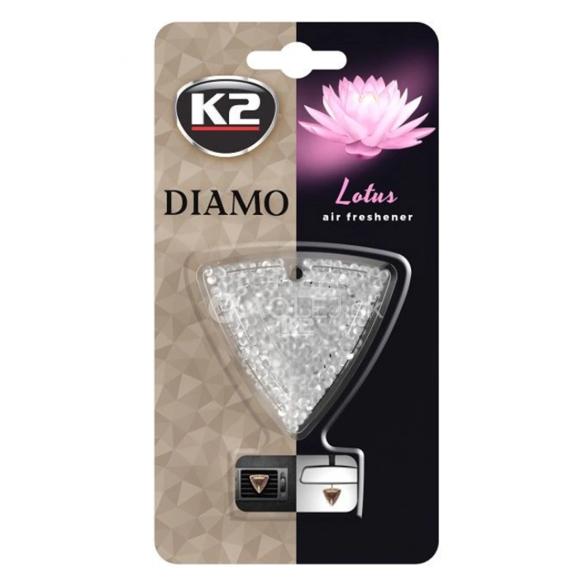 K2 Diamo Lotus je vzrušujúca a elegantná aróma osviežovača vzduchu K2 Diamo vás oslobodí od sivej časti dňa a v noci vás vrhne do rúk pulzujúceho neónového mesta. Elegantná a luxusná kráľovská aróma zaručuje maximálne pohodlie a pôžitok z jazdy. Osviežovač vzduchu K2 Diamo zdobí auto ako štýlové hodinky, dodáva mu prestížny vzhľad a zdôrazňuje charakter. Po inštalácii osviežovača vzduchu do vetracej mriežky sa uvoľní ušľachtilá aróma, ktorá dlho vydrží a príjemne stimuluje zmysly. Neobvyklá vôňa je uzavretá v polymérnych granulách umiestnených v štýlovom obale. Masívna spona umožňuje trvalé pripevnenie osviežovača vzduchu a eliminuje riziko odhalenia. Osviežovač sa dá aj povesiť do interiéru. K2 Diamo je podstatou luxusu uzavretého v jedinečnej podobe.