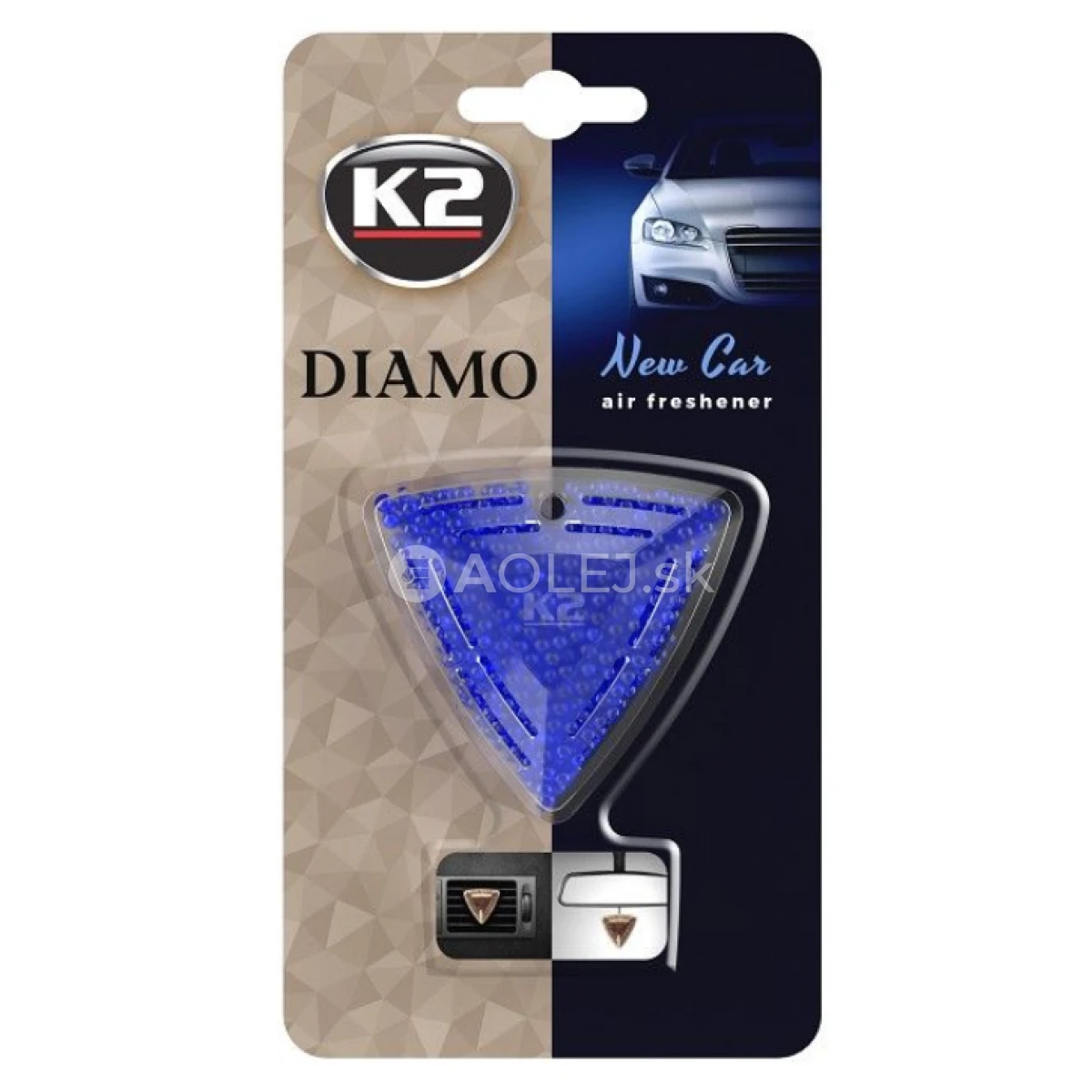 K2 Diamo New Car je vzrušujúca a elegantná aróma osviežovača vzduchu K2 Diamo vás oslobodí od sivej časti dňa a v noci vás vrhne do rúk pulzujúceho neónového mesta. Elegantná a luxusná kráľovská aróma zaručuje maximálne pohodlie a pôžitok z jazdy. Osviežovač vzduchu K2 Diamo zdobí auto ako štýlové hodinky, dodáva mu prestížny vzhľad a zdôrazňuje charakter. Po inštalácii osviežovača vzduchu do vetracej mriežky sa uvoľní ušľachtilá aróma, ktorá dlho vydrží a príjemne stimuluje zmysly. Neobvyklá vôňa je uzavretá v polymérnych granulách umiestnených v štýlovom obale. Masívna spona umožňuje trvalé pripevnenie osviežovača vzduchu a eliminuje riziko odhalenia. Osviežovač sa dá aj povesiť do interiéru. K2 Diamo je podstatou luxusu uzavretého v jedinečnej podobe.
