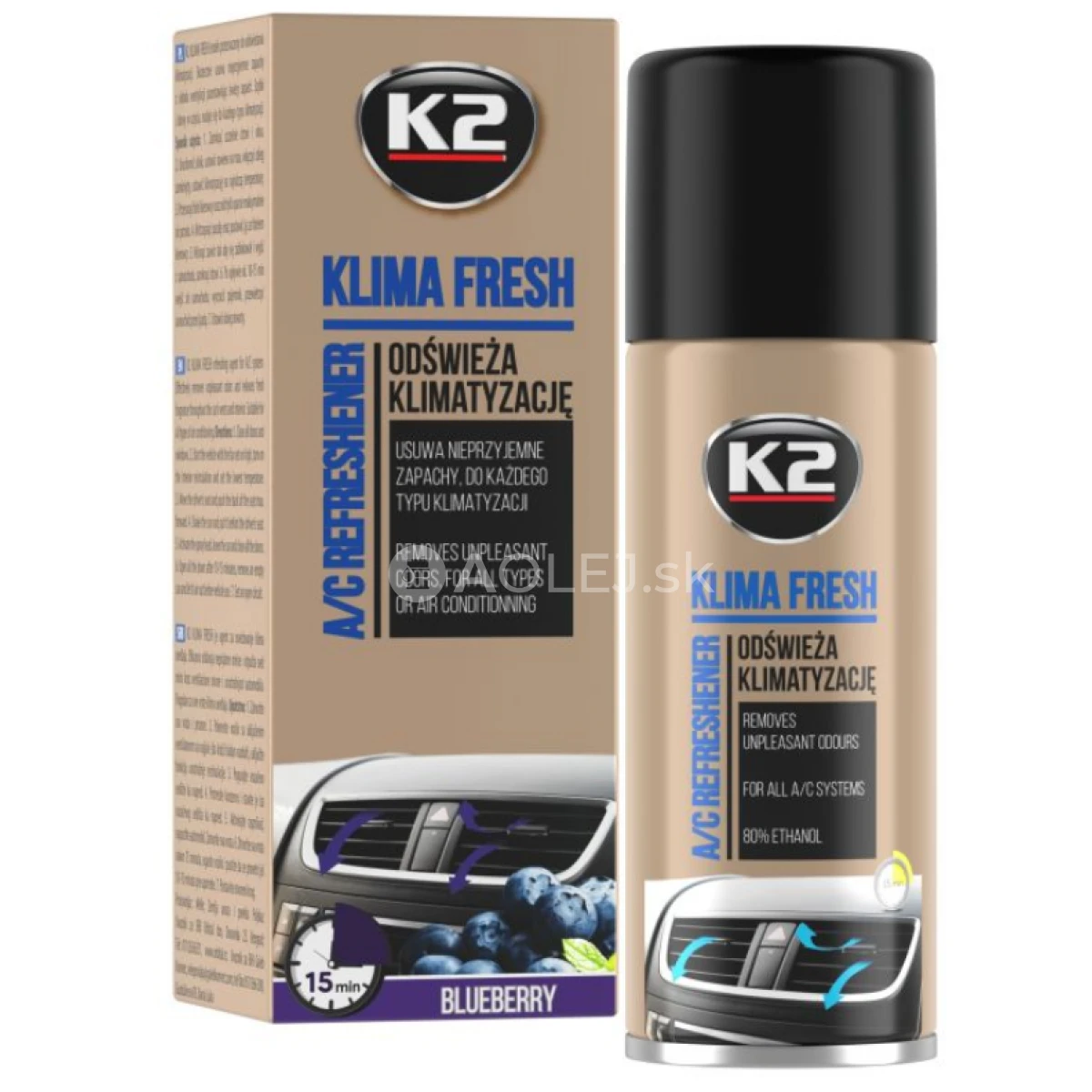 K2 Klima Fresh Blueberry je vysoko efektívny a ľahko použiteľný prostriedok pre osvieženie vzduchu vo vašom aute s vôňou čučoriedok. Celý proces netrvá viac ako niekoľko minút. Vhodné na použitie pre všetky druhy klimatizácie. Odstraňuje pachy plesní, dymu a živočíšneho pôvodu, zanecháva príjemnú sviežu vôňu s účinnosťou po niekoľko mesiacov. Neobsahuje alergény.