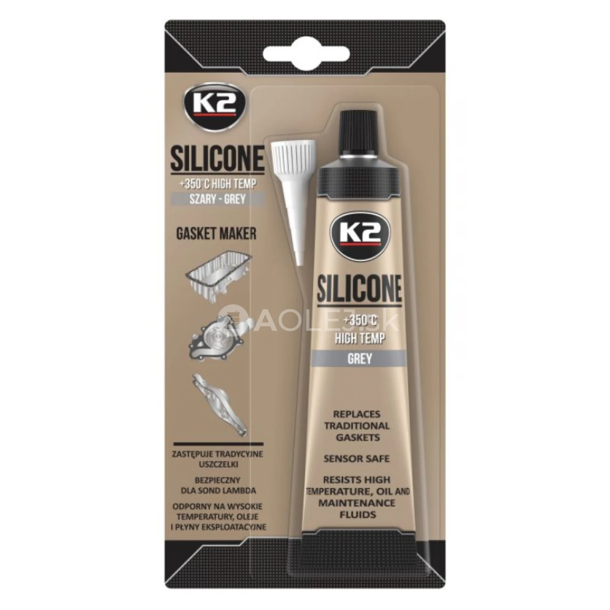 K2 Silikón sivý 350°C je vysoko kvalitný sivý silikón. Dokonale sa hodí na utesnené povrchy. Odolný voči vysokým teplotám až do + 350°C. Spĺňa požiadavky výrobcov automobilov (O.E.M. - výrobca originálneho vybavenia). Nahrádza tradičné tesnenia: korok, papier, plsť, azbest a guma. Vďaka receptu SENSOR SAFE je bezpečný pre lambda senzory používané v moderných automobiloch s elektronickým vstrekovaním paliva. Odolný voči: olejom, tukom, chladiacim kvapalinám atď. Môže byť použitý pre všetky modely a značky automobilov, vrátane na tesnenie: kryty ventilov, tesnenia termostatov, olejové vane, kryty vačkových hriadeľov, vodné čerpadlá, kryty zadnej nápravy a mnoho ďalších prvkov, kde je potrebná tesnosť a odolnosť voči vysokým teplotám.