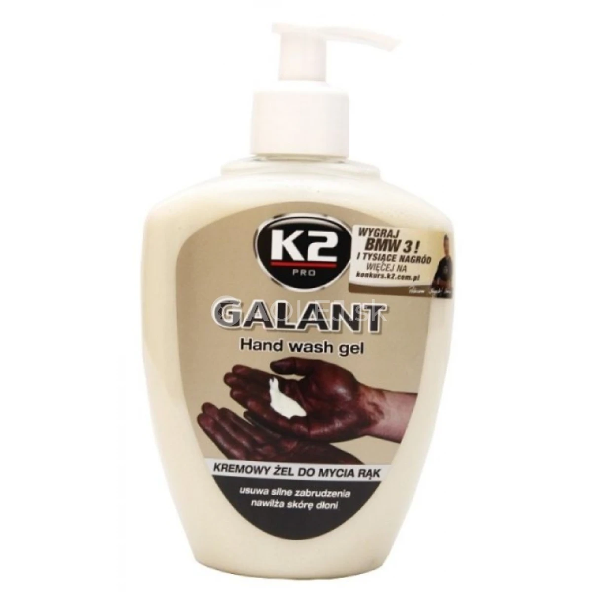 K2 Galant Hand Gel je gél na znečistené ruky. Mimoriadne efektívny a účinný krémový gél na umývanie rúk. Rýchlo a účinne odstraňuje mastnotu, farby, laky a iné ťažké nečistoty. Tento vynikajúci výrobok je vhodný pre mechanikov a maliarov. Zvlhčuje, regeneruje a chráni pokožku, nedráždi ju. Nevysušuje pokožku ani pri opakovanom každodennom umývaní. Neobsahuje pemzu, preto neupcháva odtoky. Obsahuje prírodný pomarančový esenciálny olej. Môže sa použiť aj na pranie pracovných odevov. Dermatologicky testovaný.