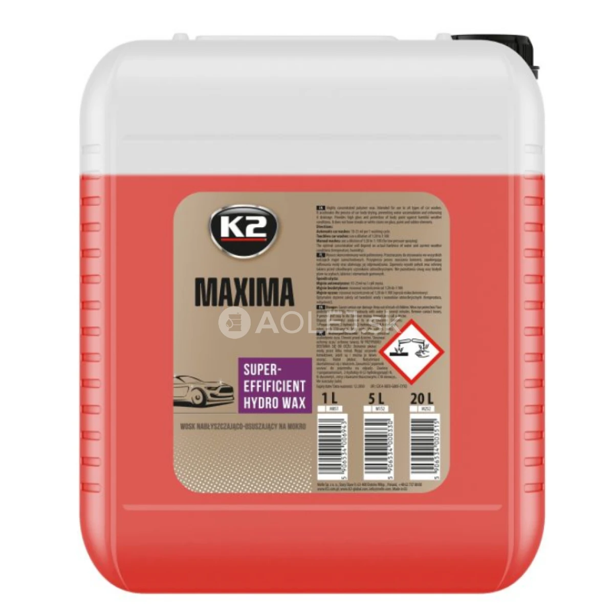 K2 Maxima je hydrovosk na sušenie a leštenie vozidiel v automatických autoumyvárňach s núteným vetraním a v ručných autoumyvárňach. Po aplikácii nezanecháva biele šmuhy na oknách a karosérii auta. Dávkovaný a nastriekaný na vopred umytú karosériu auta umožňuje okamžitú fragmentáciu vodnej vrstvy na kvapôčky, ktoré sa dajú ľahko odstrániť núteným vetraním alebo ručne „zberačom“. Nevyžaduje použitie ďalších sušiacich produktov. Zanecháva na aute tenkú ochrannú vrstvu, ktorá zaisťuje výrazný lak. Dobrá pevnosť pri nízkych teplotách okolo 0 ° C a dobrá kompatibilita s vápencovými vodami umožňujú vynikajúci výkon v zime a vo veľmi tvrdej vode až do 60 ° F. Aby sa to potvrdilo, musia sa vykonať praktické testy. Nepoškodzuje gumené povrchy. Vhodné na použitie za studena aj za tepla.