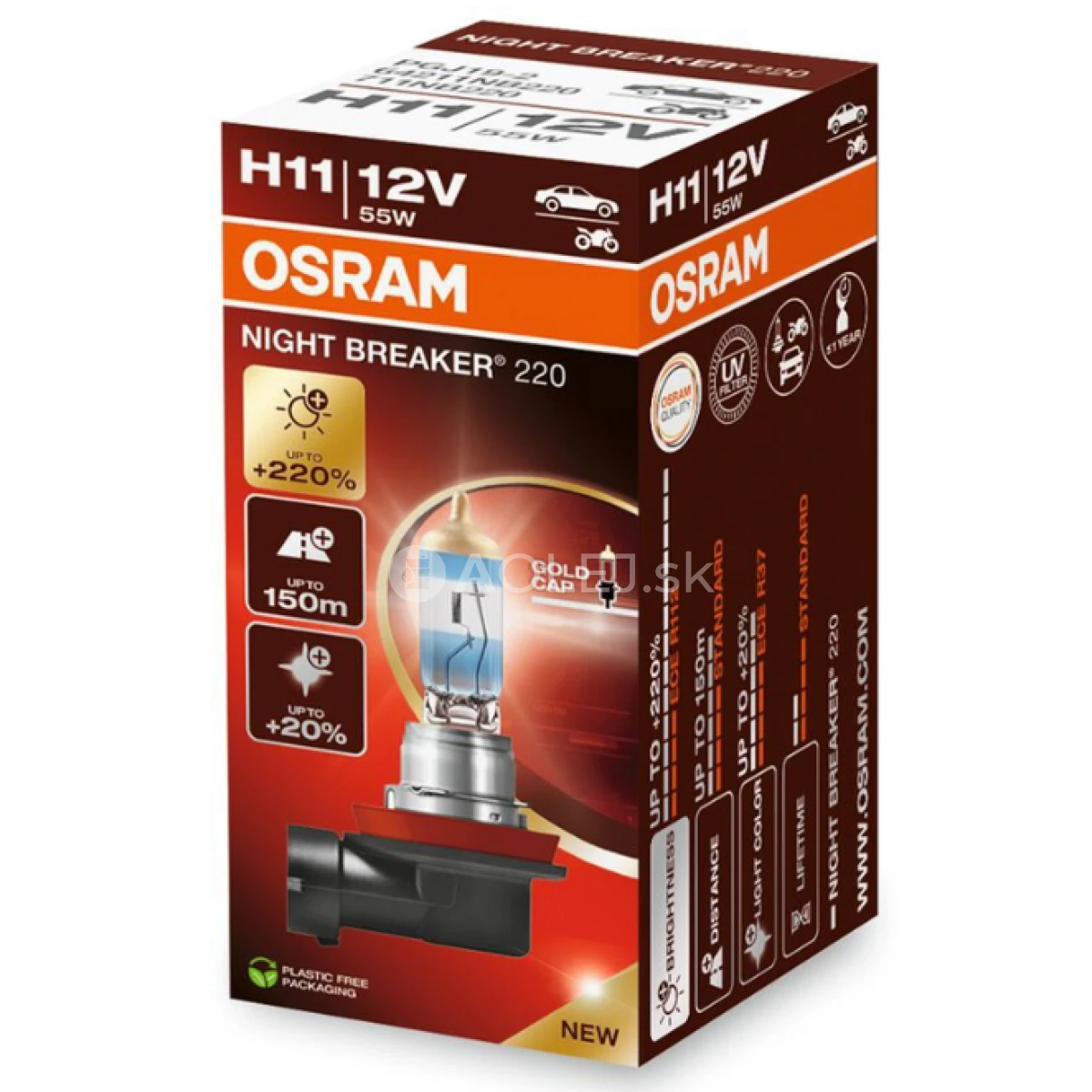 Osram H11 12V 55W PGJ19-2 Night Breaker 220% je vrcholom vývoja žiaroviek spoločnosti Osram a zaručuje nevýdaný svetelný výkon na trhu s halogénovými žiarovkami. Svetelný zdroj schválený EHK, ktorý je možné legálne použiť na ceste, poskytuje vysokú viditeľnosť a bezpečnosť aj na miestach, kde už nestačia štandardné žiarovky. OSRAM H11 NIGHT BREAKER® 220% vám poskytne sebadôveru a istotu, že vidíte a ste videní.