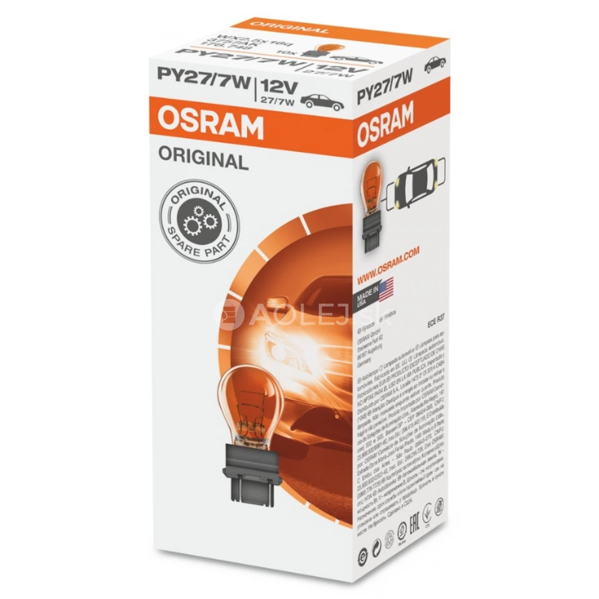 Osram PY27/7W 12V 27/7 W2.5x16q Original je halogénová žiarovka určená pre automobilové osvetlenie, špecificky pre aplikácie ako predné alebo zadné svetlá, brzdové svetlá a indikátory smeru (blinkre). Tento model patrí do série Osram Original, ktorá sa vyznačuje spoľahlivosťou, vysokou kvalitou a dlhou životnosťou.