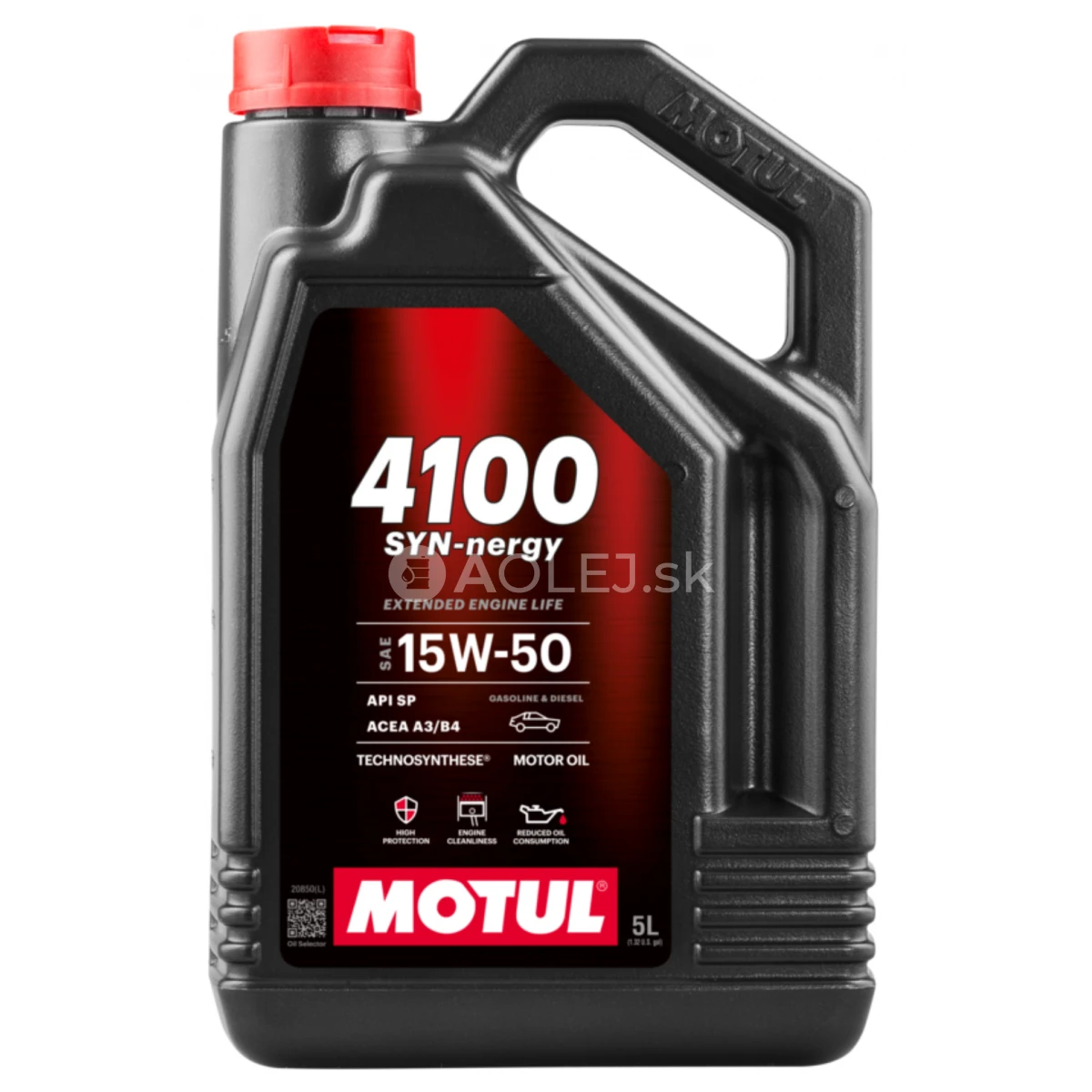 Motul 4100 SYN-nergy 15W-50 je motorový olej na báze syntetickej technológie Technosynthese® špeciálne navrhnutý pre automobily poháňané benzínovými alebo naftovými motormi s prirodzeným nasávaním alebo turbodúchadlom, s nepriamym alebo priamym vstrekovaním. Poskytuje vynikajúcu čistotu motora a vysokú ochranu pre predĺženú životnosť motora.