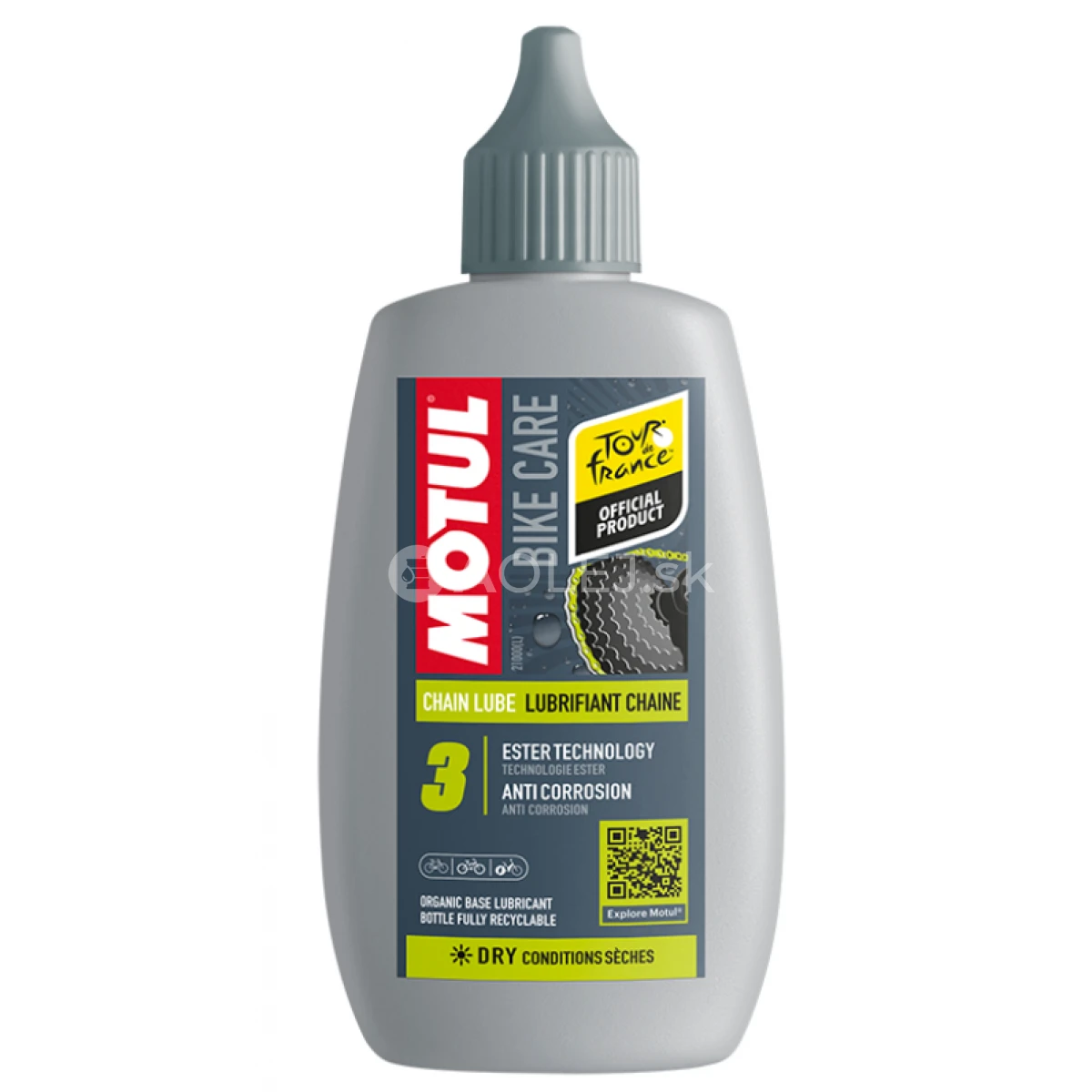 Motul Bike Care - Chain Lube Dry Road uľahčuje dôkladné premazanie všetkých typov reťazí bicyklov. MOTUL Chain Lube Dry prináša pomocou najmodernejšej esterovej technológie najvyššie štandardy mazania reťazí a pohonov bicyklov používaných v suchých podmienkach, pričom je plne biologicky odbúrateľný. Technológia MOTUL Ester poskytuje vysoko polárne molekuly s extrémne vysokou schopnosťou zatečenia do režaze pre trvalú priľnavosť a maximálnu odolnosť voči tlaku. To prevyšuje výkon iných známych reťazových mazív, napr. so zložením s obsahom pevných látok (ako napríklad s PTFE). Vhodný pre štandardné aj elektrické bicykle.