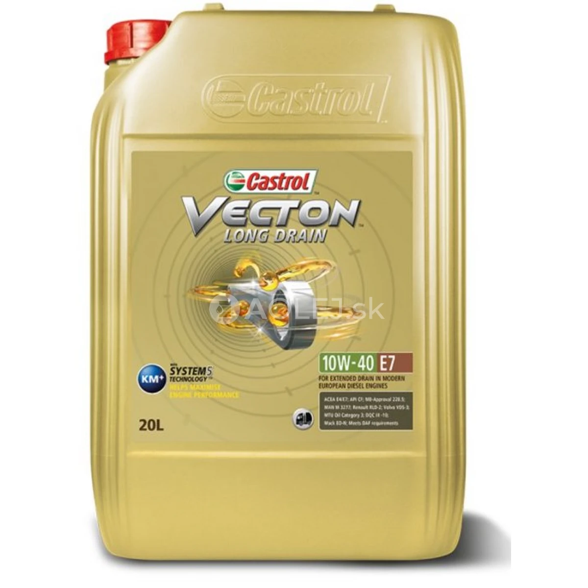 Castrol Vecton Long Drain 10W-40 E7 je nový olej s dlhým intervalom výmeny je zdokonalený, plne syntetický olej, špecificky navrhnutý pre predĺžený výmenný interval až do 100000km² v moderných európskych naftových motoroch vrátane Euro IV³, Euro III a Euro II európskych nákladných vozidlách a autobusoch. Je vhodný aj pre off-road automobily a zariadenia.