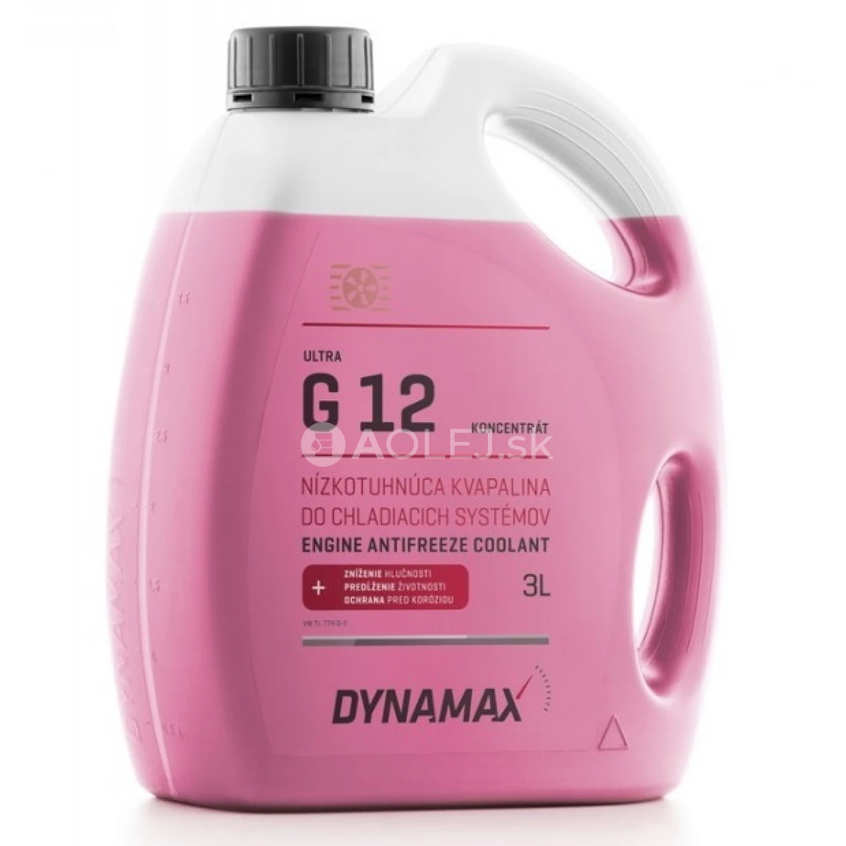 Koncentrovaná nízkotuhnúca chladiaca kvapalina určená pre najmodernejšie druhy motorov. DYNAMAX ULTRA G12 je vysoko kvalitná nízkotuhnúca zmes vyrobená z monoetylénglykolu s vysoko progresívnymi antikoróznymi prísadami, zvlášť vhodná pre chladiče moderných hliníkových a zliatinových chladiacich sústav spaľovacích motorov. Celoročne chráni chladiaci systém motorového vozidla pred pôsobením mrazu a pred koróziou. Zaručuje veľmi dobrý prevod tepla. V roku 2008 získala chladiaca kvapalina DYNAMAX ULTRA G12 prestížne ocenenie Zlatú medailu a Certifikát ochrannej známky kvality Slovak Gold. Obsahuje látku brániacu požitiu chladiacej kvapaliny.