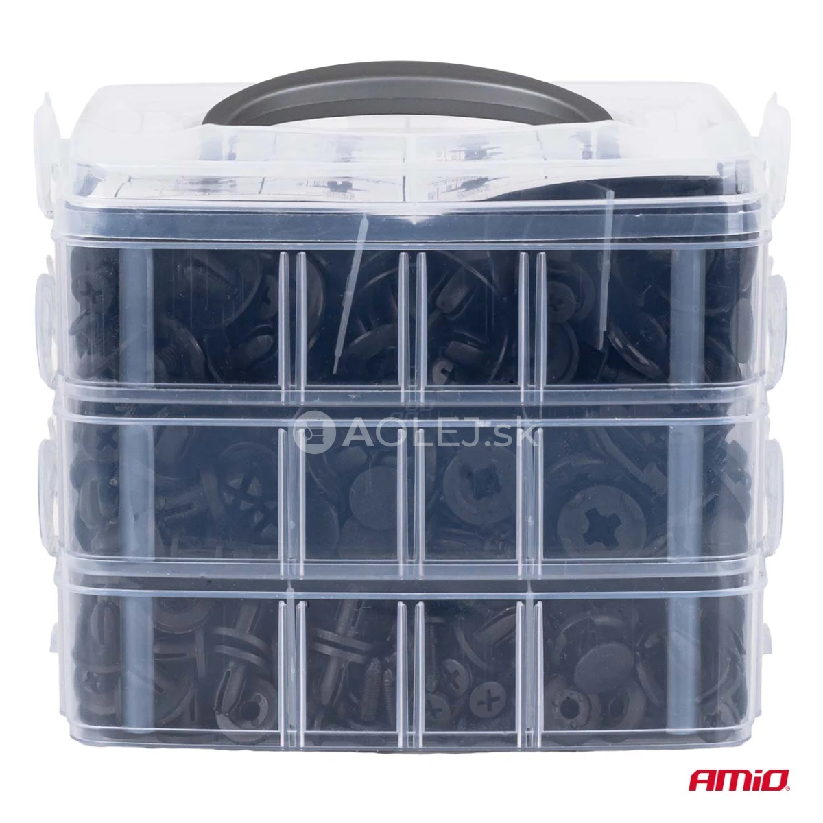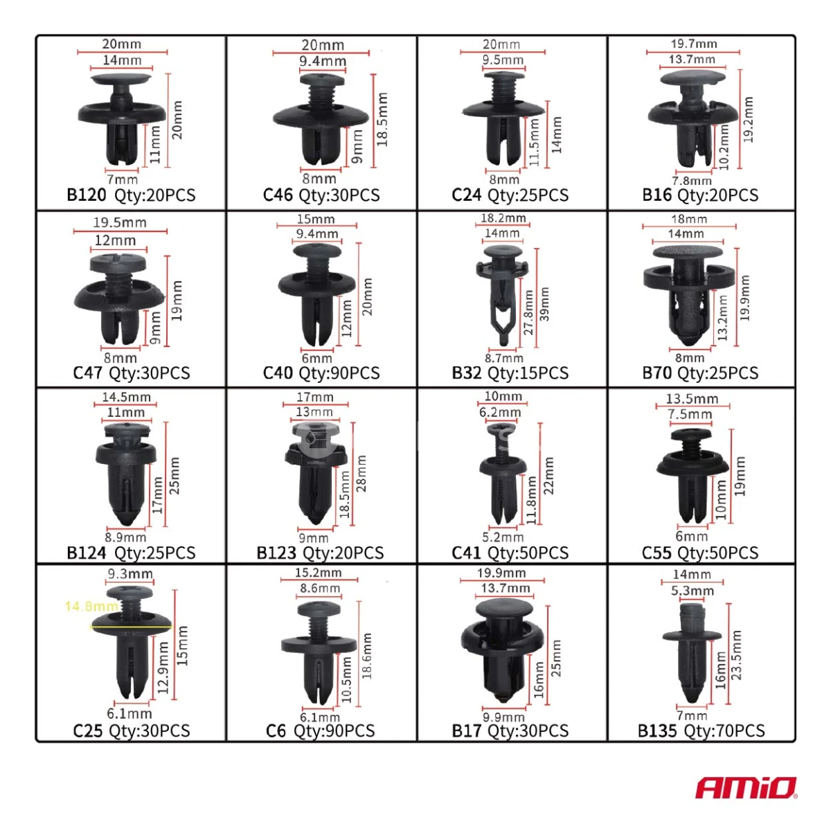 Sada univerzálnych upevňovacích prvkov, klipov, hmoždiniek spolu s nástrojmi na ich demontáž – celkom 650 kusov. Vyrobené z vysoko kvalitného PVC plastu, ktorý zaručuje odolnosť a dlhú životnosť. Súprava obsahuje prvky v štandardných rozmeroch, ktoré sa používajú vo väčšine osobných áut, dodávok aj špeciálnych vozidiel.