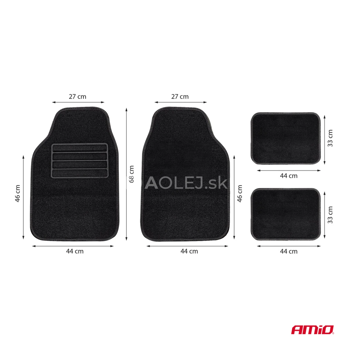 Súprava obsahuje 4 kusy – dve predné a dve zadné rohože – navrhnuté tak, aby sa prispôsobili väčšine štandardných interiérov. Protišmyková spodná vrstva obmedzuje posúvanie počas jazdy, čím zvyšuje komfort a bezpečnosť používania.