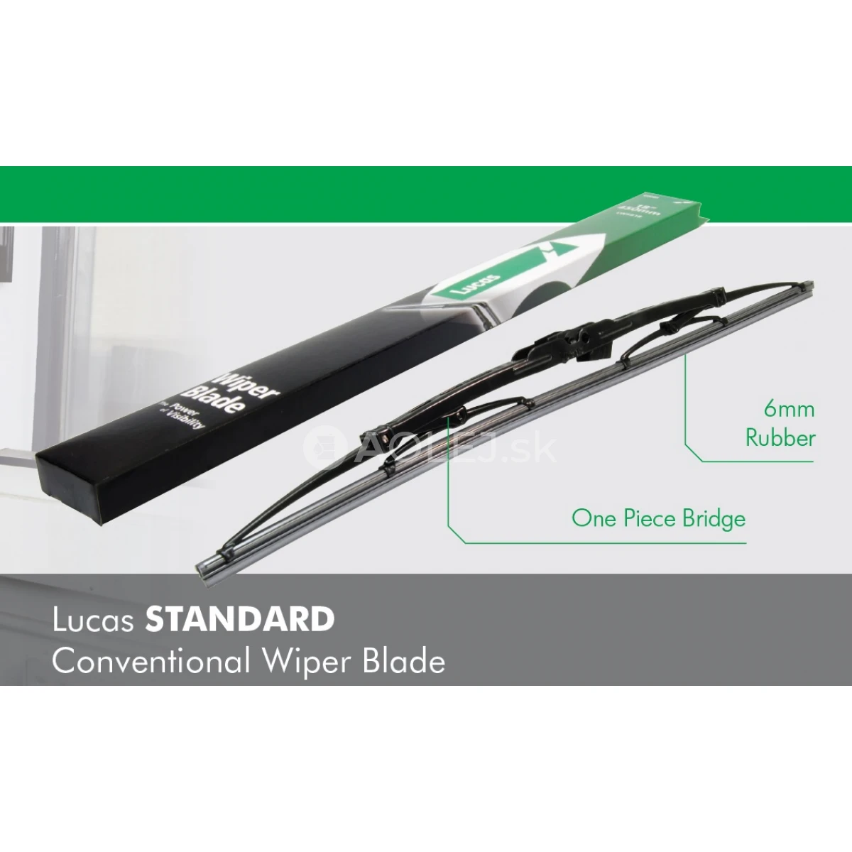 Lucas štandardný stierač Eco bez spojlera. Štandardný stierač, s grafitovou úpravou stieracej gumy, vhodný na nasledovné typy ramiem áut: hák, bajonet, kolík, odnímateľný kolík.