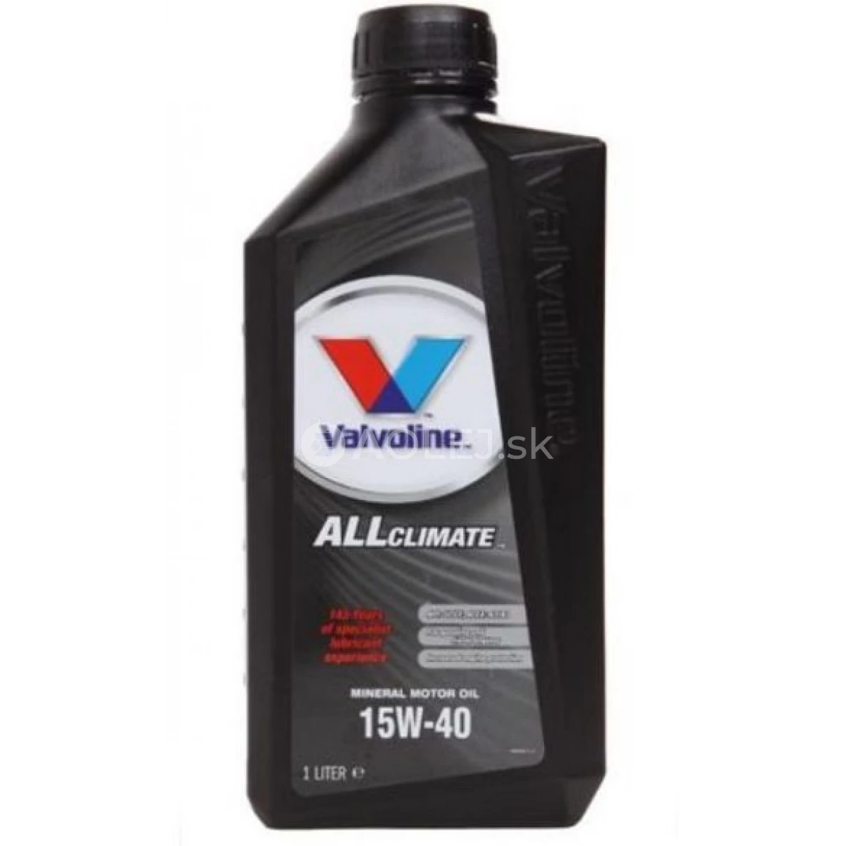 Valvoline All Climate 15W-40 je minerálny univerzálny celoročný motorový olej pre osobné vozidlá, dodávky s benzínovými a nepreplňovanými naftovými motormi. Olej pomáha udržiavať čistý motor a je určený pre normálne prevádzkové podmienky. Vyvážené celoročné vlastnosti podporujú jednoduché štartovánie a optimálne mazanie v širokom rozmedzí prevádzkových teplôt.