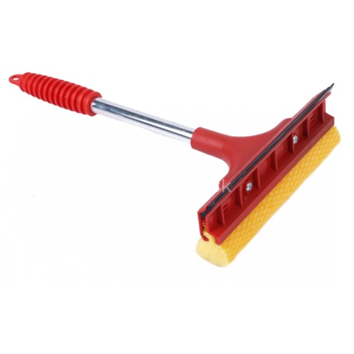 Praktická stierka s gumovým ostrím a zabudovanou hubkou, vybavená krátkou kovovou rukoväťou.