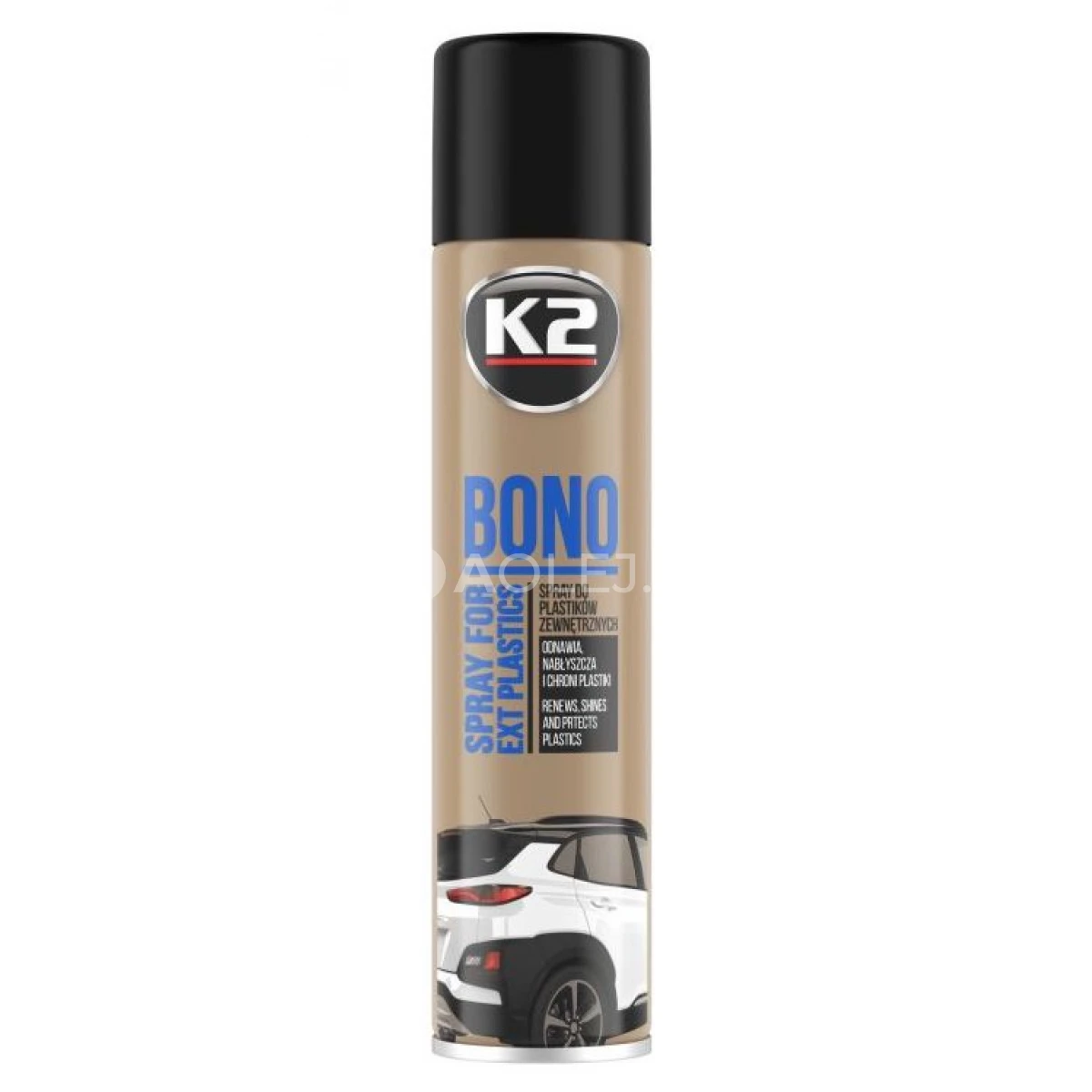 K2 Bono je veľmi účinný prípravok na čistenie, obnovu všetkých povrchov z plastu, vinylu, gumy a pod. Je ideálny na čistenie nárazníkov, spojlerov a ostatných plastových dielov automobilov. Zabezpečuje dlhotrvajúci efekt pred vyblednutím, vysušením a pôsobením UV žiarenia. Vďaka jeho antistatickým vlastnostiam chráni pred usadzovaním prachu a nečistôt.