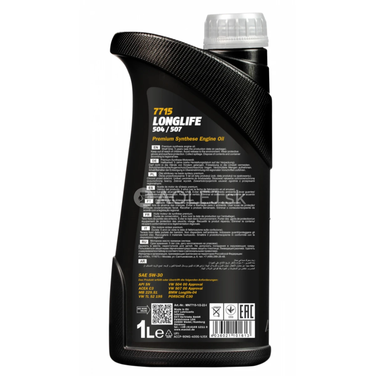 Mannol Longlife 504/507 5W-30 je motorový olej určený pre moderné benzínové a naftové motory automobilov značiek VW, Škoda, Audi, Seat, BMW, Mercedes a ďalších. Je vhodný pre motory s priamym vstrekovaním, s preplňovaním aj bez turbodúchadla, vrátane motorov vybavených systémom čerpadlo-vstrekovač (Pumpe-Düse).