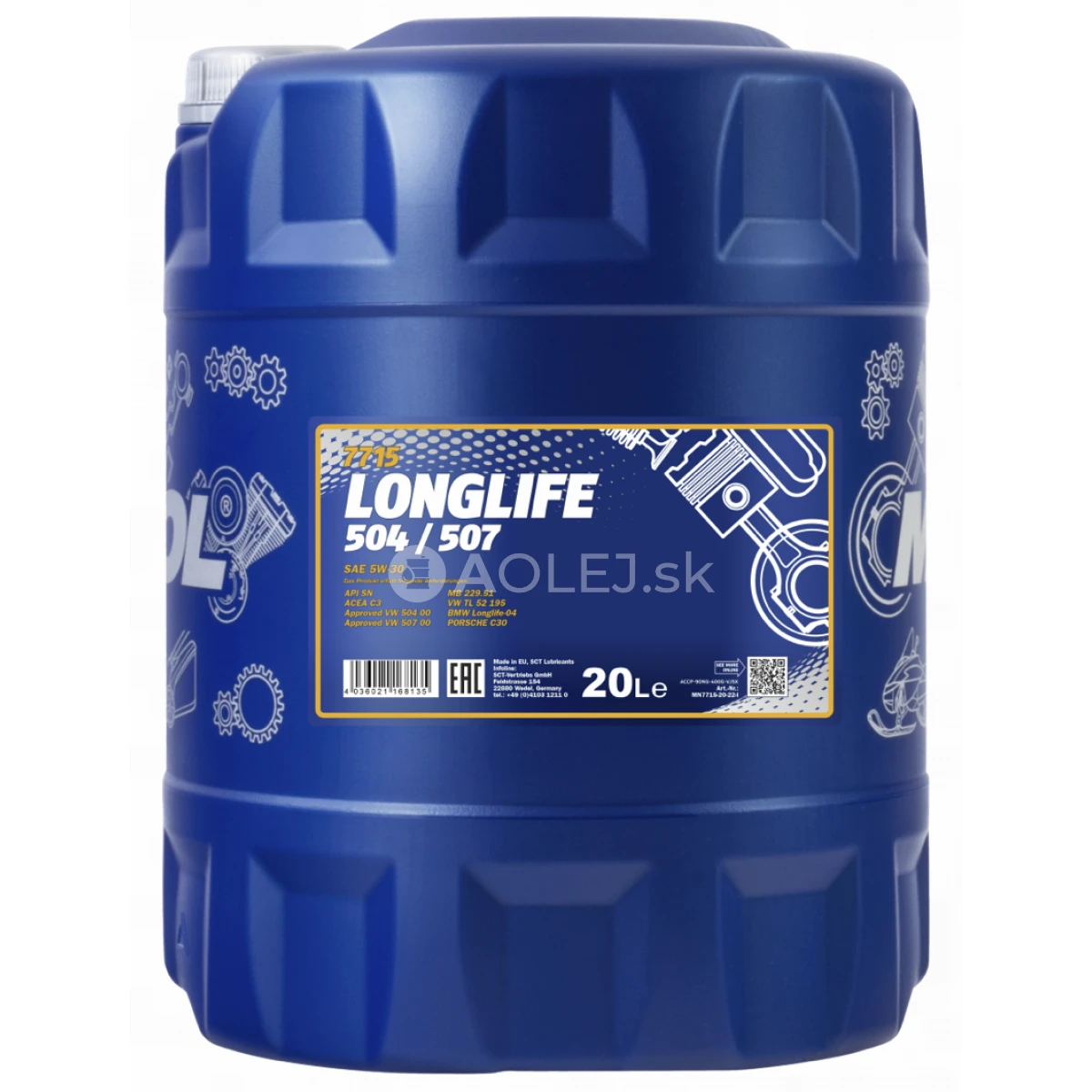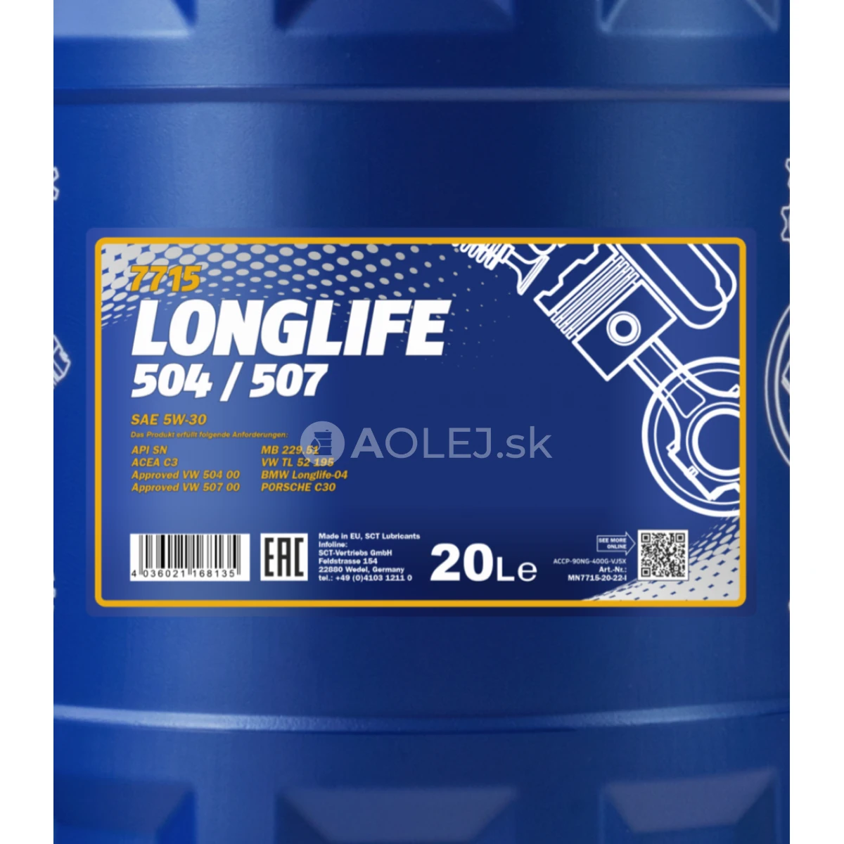 Mannol Longlife 504/507 5W-30 je motorový olej určený pre moderné benzínové a naftové motory automobilov značiek VW, Škoda, Audi, Seat, BMW, Mercedes a ďalších. Je vhodný pre motory s priamym vstrekovaním, s preplňovaním aj bez turbodúchadla, vrátane motorov vybavených systémom čerpadlo-vstrekovač (Pumpe-Düse).
