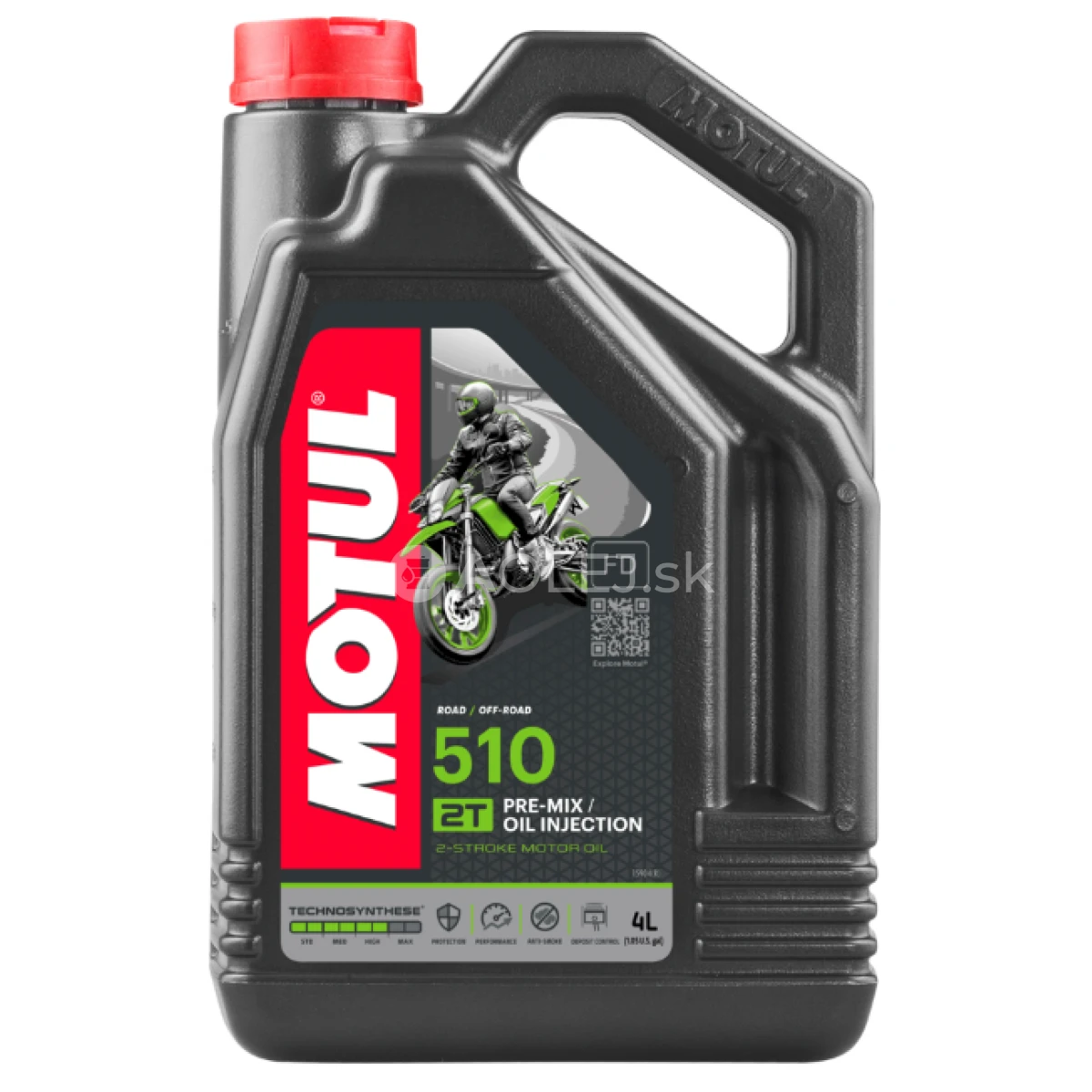 MOTUL 510 2T je olej špeciálne vyvinutý pre motocykle a skútre s dvojtaktným motorom. Všetky typy benzínu. Zloženie znižujúce dymivosť. Vhodný aj pre premix systém alebo vstrekovanie. Vhodný aj pre katalyzátory.