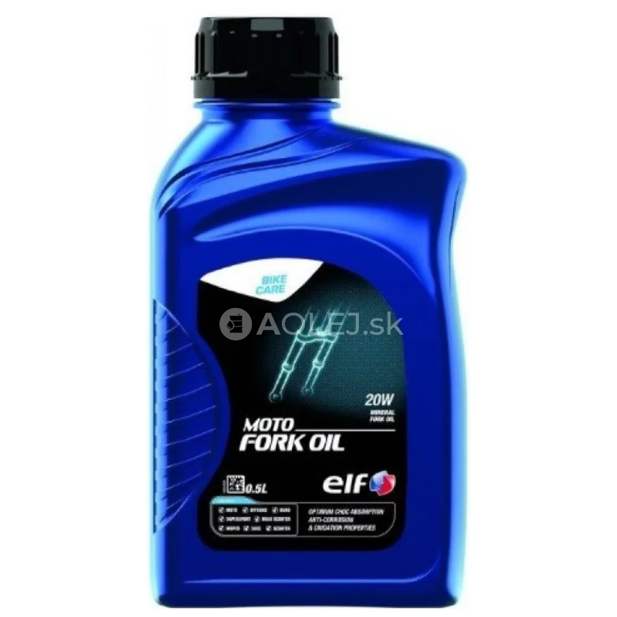 ELF MOTO FORK OIL 20W je olej do vidlíc a tlmičov. Poskytuje optimálnu bezpečnosť pre celý systém odpruženia cestných a terénnych motocyklov. Je vyrobený z vybraných minerálnych zmesí spevnených špeciálnymi aditívami, ktoré mu poskytujú množstvo vlastností, ako je napr. vysoká odolnosť proti opotrebovaniu. Zaručuje optimálne tlmenie po celý rok a je stabilný. Má vynikajúce správanie na vzduchu: obmedzené prebublávanie a veľmi rýchle odvzdušnenie. Je výborne kompatibilný s elastomérmi používanými vo vidliciach motocyklov a tlmičoch.