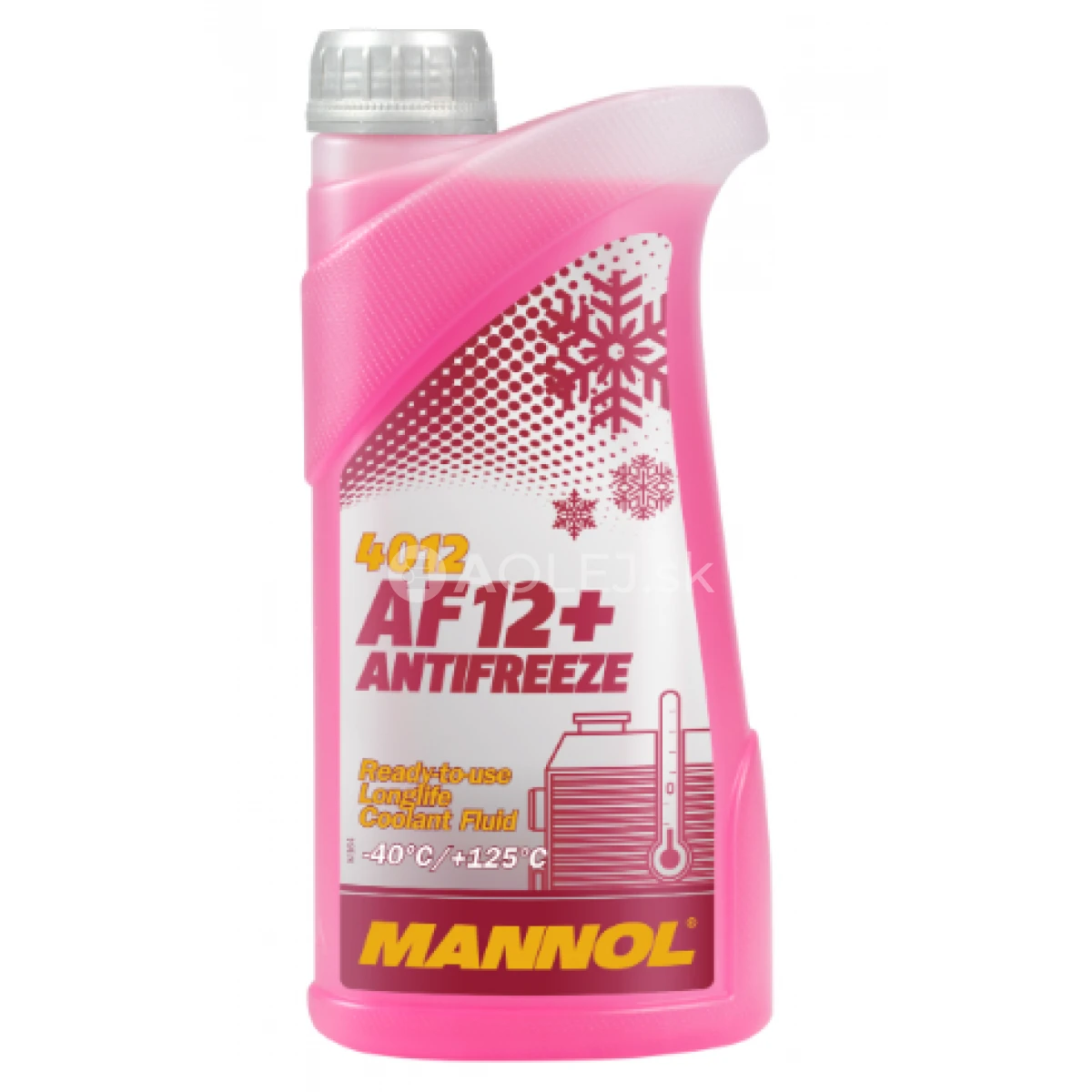 Mannol 4012 Antifreeze AF12+ (-40°C) Longlife je koncentrát na monoetilenglikolovom základe, je určený pre celoročné použitie v moderných chladiacich systémoch. Chráni proti korózii, zabráňuje usadenínám a peneniu. Nerozožiera tesnenia a hadice. Neobsahje nitráty a fosfáty. Koncentrát pripravený na použitie, bez ďaľšieho riedenia poskytuje dostatočnú ochranu do -40°C. Životnosť až 5 rokov.