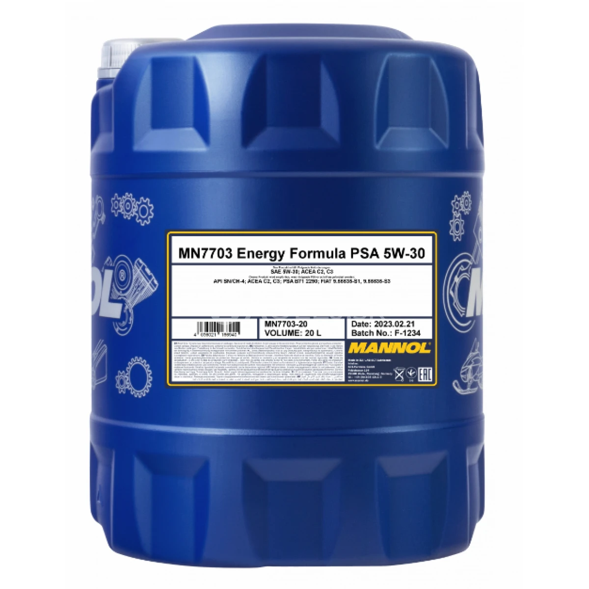 Mannol 7703 Energy Formula PSA 5W-30 inovatívny, univerzálny, energeticky úsporný, plne syntetický prémiový motorový olej s obsahom esterov, špeciálne navrhnutý pre benzínové a naftové motory vo vozidlách PEUGEOT a CITROËN, so zameraním na náročné požiadavky a predĺžené intervaly výmeny motorového oleja. Určené pre benzínové a naftové motory osobných a ľahkých nákladných automobilov vyrobených v Európe a iných krajinách spĺňajúce normy EURO III, IV, V, vybavené katalyzátormi (TWC) a filtrami pevných častíc (DFP/FAP), kde olej SAE 5W-30 spĺňa ACEA Odporúča sa štandardy C3 a C2 a vyhovujúce špecifikácii PSA B71 2290.