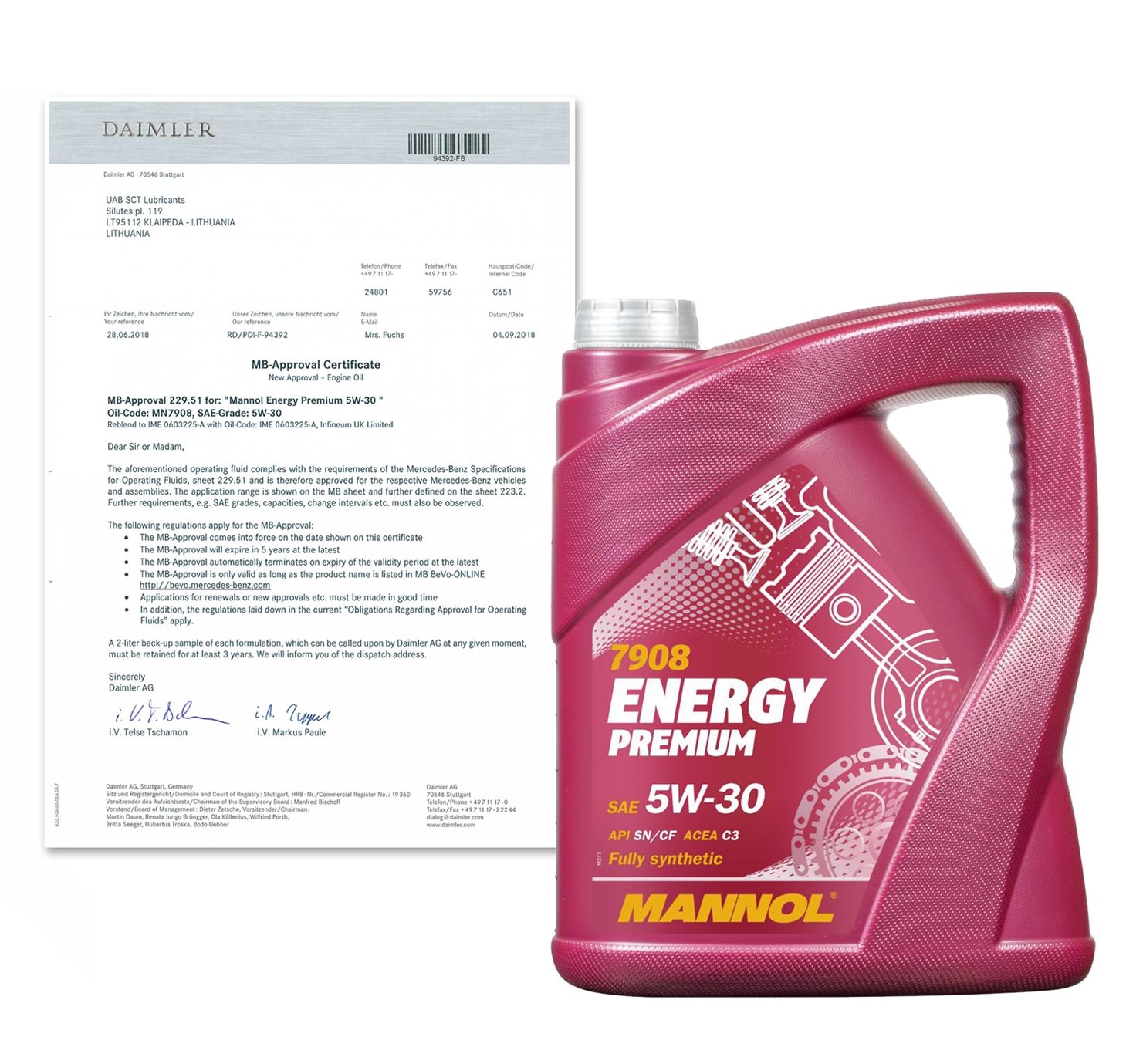 Mannol 7908 Energy Premium 5W-30 je inovatívny, všestranný prémiový syntetický motorový olej s obsahom syntetických esterov pre moderné naftové a plynové preplňované a nepreplňované motory. Navrhnuté v súlade s požiadavkami európskych výrobcov automobilov. Určené pre benzínové a naftové motory v širokej flotile osobných automobilov, ľahkých SUV, minibusov a ľahkých nákladných automobilov európskych a iných výrobcov, kde je požadovaná výkonnostná úroveň ACEA C3. Pre svoju všestrannosť sa odporúča najmä pre flotily taxislužieb. Olej nie je vhodný na použitie v ťažkých nákladných automobiloch a podobných vozidlách!