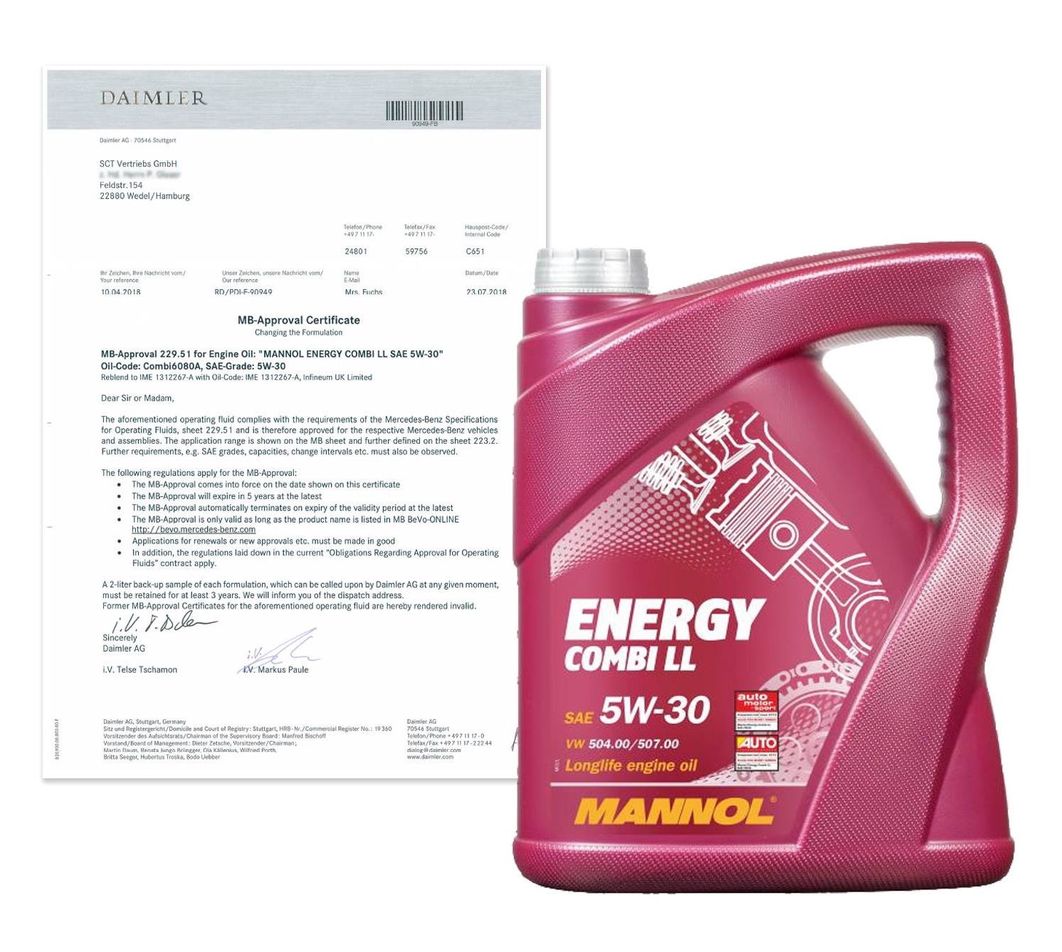 Mannol 7907 Energy Combi LL 5W-30 je inovatívny univerzálny viacstupňový bisyntetický (PAO + estery) prémiový motorový olej pre moderné benzínové a naftové motory (vrátane motorov s priamym vstrekovaním) s turbodúchadlom aj bez neho, vrátane tých, ktoré sú vybavené dýzami čerpadla (Pumpe-Duse). Navrhnuté na základe požiadaviek VW a DAIMLER. Určené pre benzínové a naftové motory normy EURO IV a EURO V širokej flotily automobilov (osobné, ľahké SUV, mikrobusy a ľahké nákladné vozidlá) európskych a iných výrobcov).