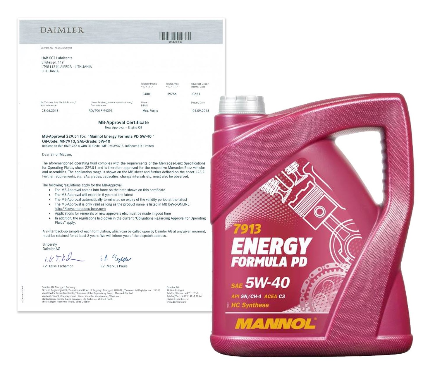 Mannol 7913 Energy Formula PD 5W-40 je inovatívny univerzálny, energeticky úsporný plne syntetický prémiový motorový olej s obsahom esterov pre moderné dieselové motory (vrátane motorov s priamym vstrekovaním) a benzínové motory s preplňovaním aj bez neho, vrátane tých, ktoré sú vybavené dýzami čerpadla (Pumpe-Duse). Navrhnuté na základe požiadaviek VW a DAIMLER. Určené pre benzínové a naftové motory normy EURO IV a EURO V širokej flotily automobilov (osobné, ľahké SUV, mikrobusy a ľahké nákladné vozidlá) európskych a iných výrobcov). Odporúča sa na použitie v motoroch automobilov Daimler, BMW, VW, ktoré kladú dodatočné požiadavky na motorové oleje (podľa vyššie uvedených špecifikácií). Olej nie je vhodný na použitie v ťažkých nákladných automobiloch a podobných vozidlách!